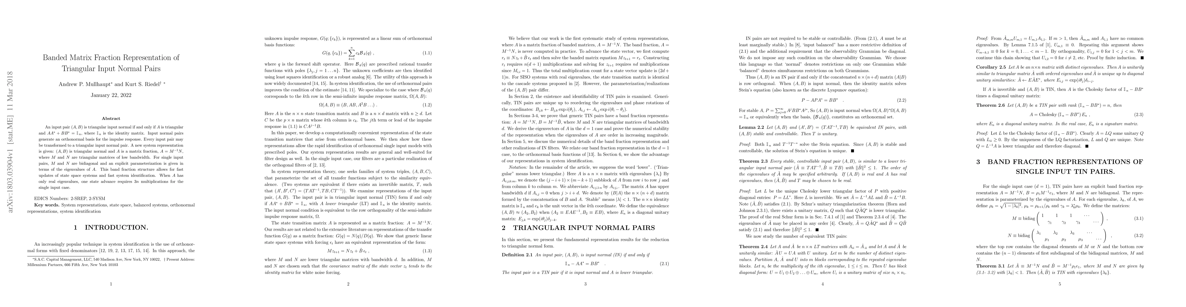 An input pair $(A,B)$ is triangular input normal if and only if $A$ is triangular and $AA^* + BB^* = I_n$, where $I_n$ is theidentity matrix. Input normal pairs generate an orthonormal basis for the impulse response. Every input pair may be transformed to a triangular input normal pair. A new system representation is given: $(A,B)$ is triangular normal and $A$ is a matrix fraction, $A=M^{-1}N$, where $M$ and $N$ are triangular matrices of low bandwidth. For single input pairs, $M$ and $N$ are bidiagonal and an explicit parameterization is given in terms of the eigenvalues of $A$. This band fraction structure allows for fast updates of state space systems and fast system identification. When A has only real eigenvalues, one state advance requires $3n$ multiplications for the single input case.