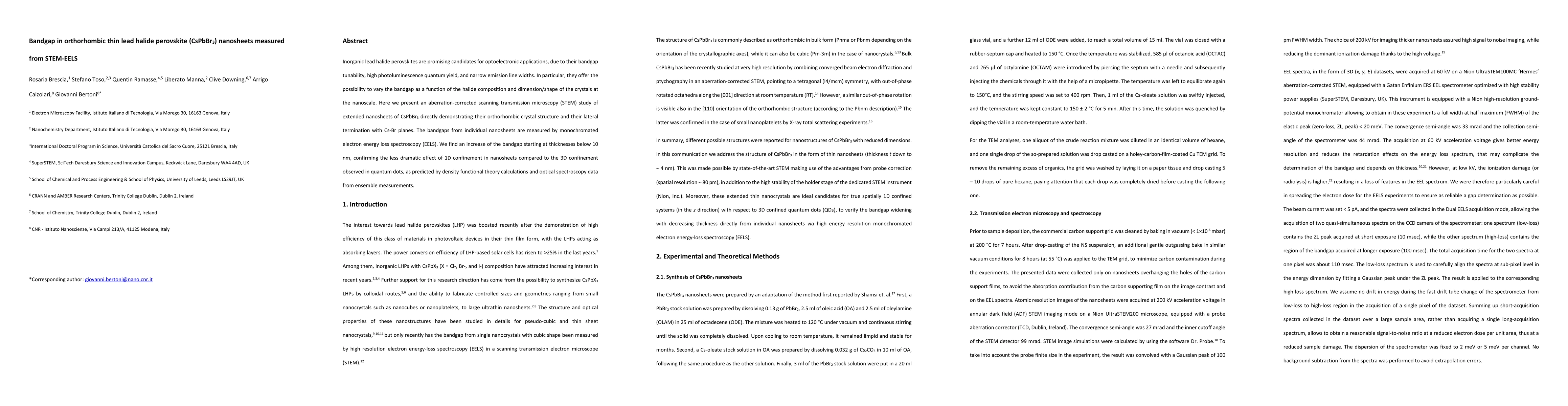 Inorganic lead halide perovskites are promising candidates for optoelectronic applications, due to their bandgap tunability, high photoluminescence quantum yield, and narrow emission line widths. In particular, they offer the possibility to vary the bandgap as a function of the halide composition and dimension/shape of the crystals at the nanoscale. Here we present an aberration-corrected scanning transmission microscopy (STEM) study of extended nanosheets of CsPbBr3 directly demonstrating their orthorhombic crystal structure and their lateral termination with Cs-Br planes. The bandgaps from individual nanosheets are measured by monochromated electron energy loss spectroscopy (EELS). We find an increase of the bandgap starting at thicknesses below 10 nm, confirming the less dramatic effect of 1D confinement in nanosheets compared to the 3D confinement observed in quantum dots, as predicted by density functional theory calculations and optical spectroscopy data from ensemble measurements.