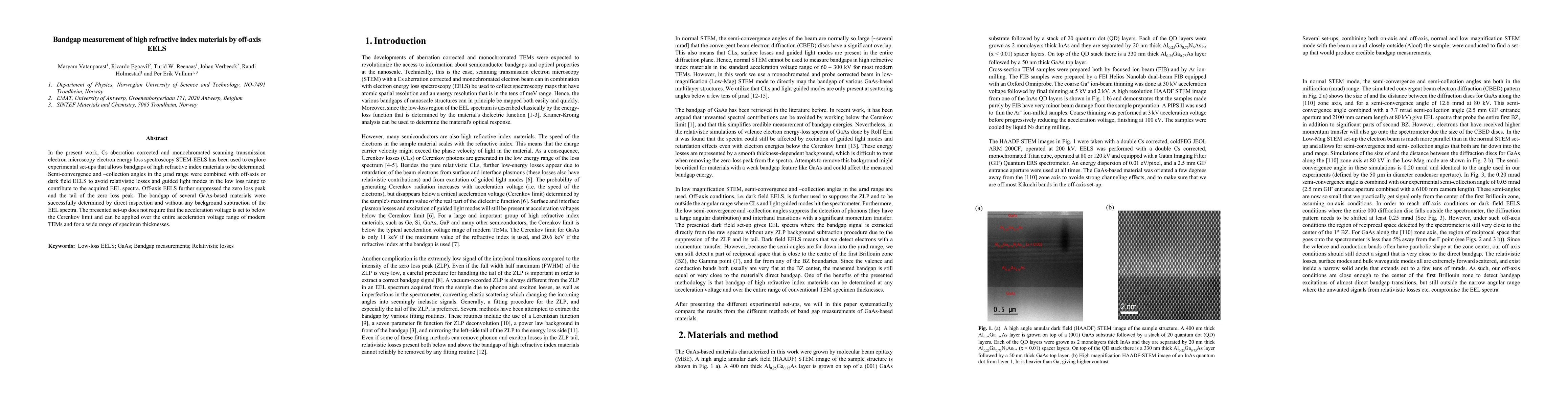 This research demonstrates the use of Cs-corrected STEM-EELS with micro-radian semi-convergence and collection angles, along with off-axis or dark field EELS, to accurately measure bandgaps of high refractive index materials like GaAs-based compounds. The method avoids relativistic losses and zero loss peak interference, eliminating the need for background subtraction. It works across a broad acceleration voltage range and various specimen thicknesses, offering a significant advancement in characterizing high refractive index materials.