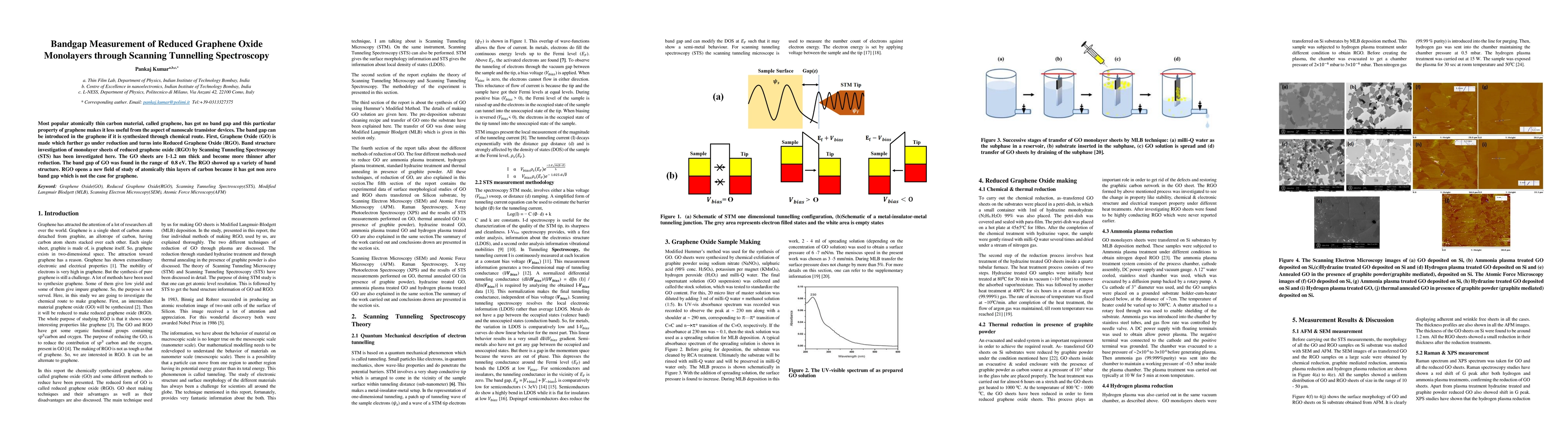 Summary: This research investigates the bandgap in Reduced Graphene Oxide (RGO) monolayers using Scanning Tunneling Spectroscopy (STS). Unlike graphene, RGO exhibits a non-zero band gap due to chemical reduction of Graphene Oxide (GO), potentially enhancing its applicability in nanoscale transistor devices.