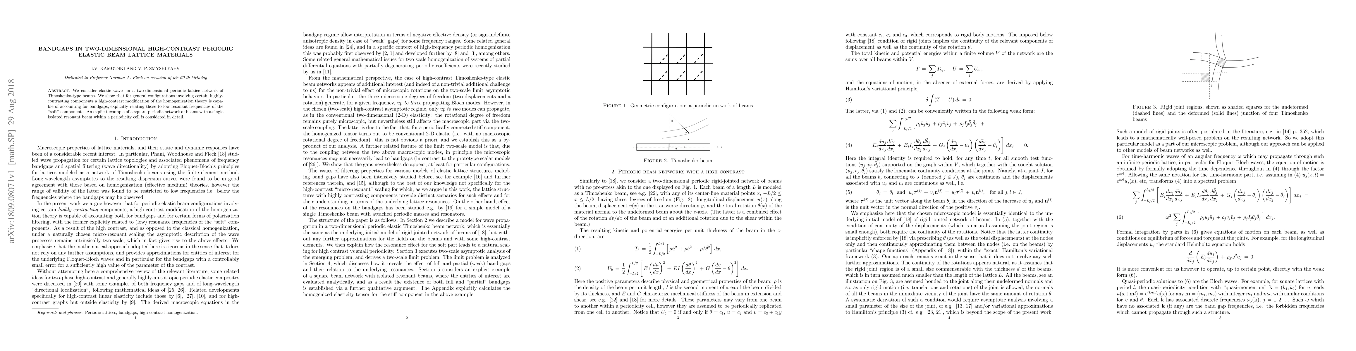 This paper investigates elastic waves in two-dimensional periodic lattices of Timoshenko-type beams, demonstrating that high-contrast homogenization theory can predict bandgaps linked to low resonant frequencies of 'soft' components. An example of a square-periodic network with an isolated resonant beam is analyzed to illustrate this phenomenon.