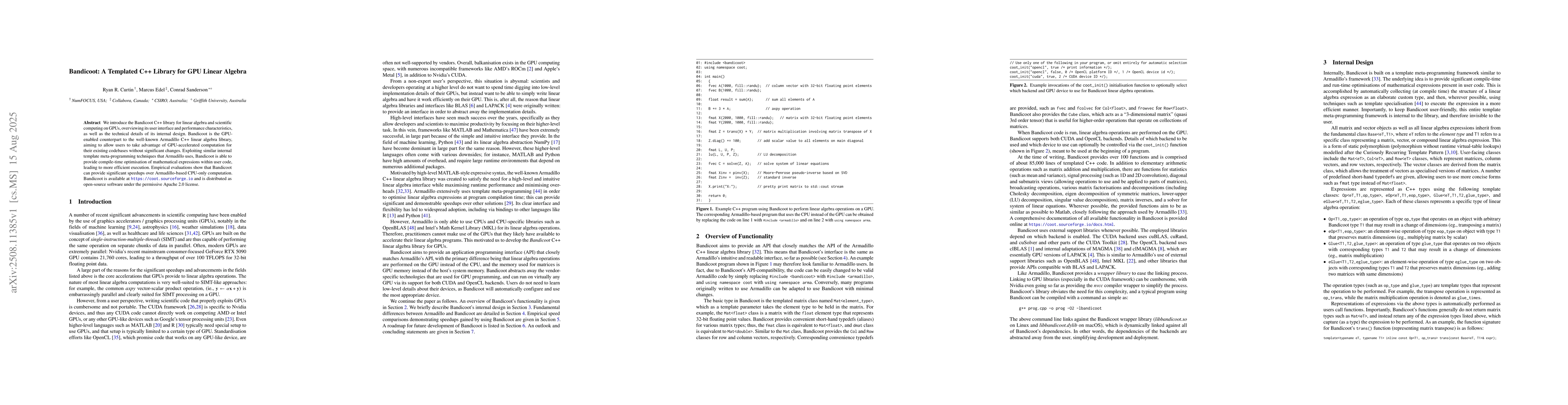 We introduce the Bandicoot C++ library for linear algebra and scientific computing on GPUs, overviewing its user interface and performance characteristics, as well as the technical details of its internal design. Bandicoot is the GPU-enabled counterpart to the well-known Armadillo C++ linear algebra library, aiming to allow users to take advantage of GPU-accelerated computation for their existing codebases without significant changes. Exploiting similar internal template meta-programming techniques that Armadillo uses, Bandicoot is able to provide compile-time optimisation of mathematical expressions within user code, leading to more efficient execution. Empirical evaluations show that Bandicoot can provide significant speedups over Armadillo-based CPU-only computation. Bandicoot is available at https://coot.sourceforge.io and is distributed as open-source software under the permissive Apache 2.0 license.