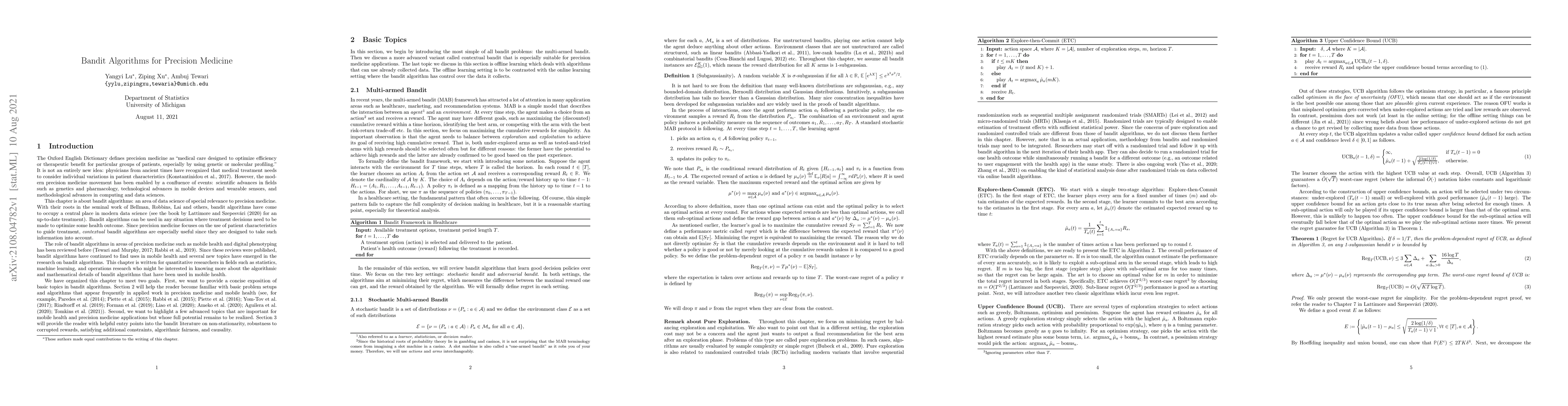 This paper explores the application of bandit algorithms in precision medicine, emphasizing their role in optimizing treatment decisions based on individual patient characteristics. It highlights the evolution and relevance of these algorithms in modern data science, particularly in mobile health and digital phenotyping.