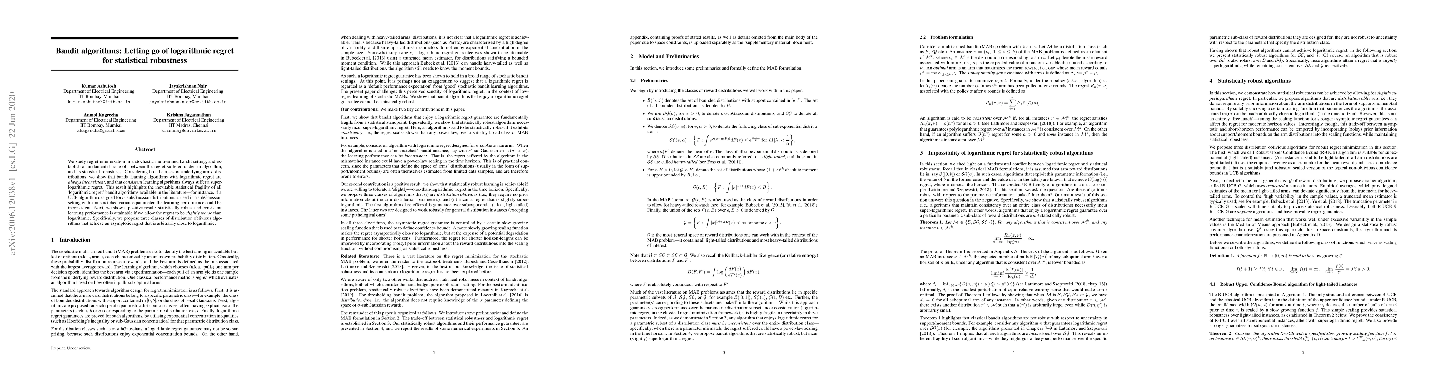 This paper explores the trade-off between regret minimization and statistical robustness in stochastic multi-armed bandit problems, demonstrating that algorithms with logarithmic regret are inherently inconsistent. It proposes new distribution-oblivious algorithms achieving near-logarithmic regret with improved statistical robustness.