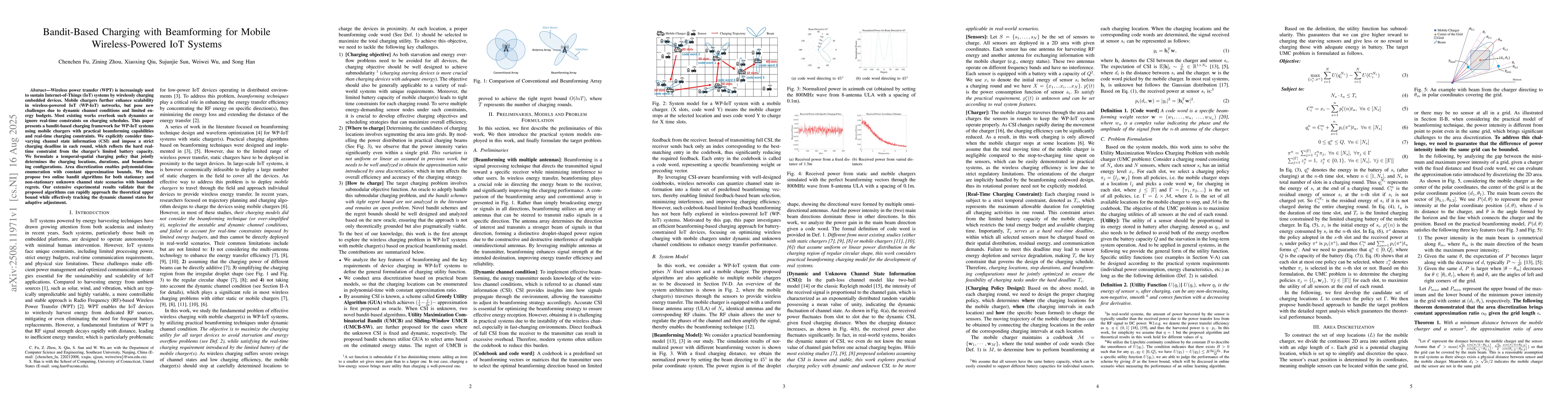 Wireless power transfer (WPT) is increasingly used to sustain Internet-of-Things (IoT) systems by wirelessly charging embedded devices. Mobile chargers further enhance scalability in wireless-powered IoT (WP-IoT) networks, but pose new challenges due to dynamic channel conditions and limited energy budgets. Most existing works overlook such dynamics or ignore real-time constraints on charging schedules. This paper presents a bandit-based charging framework for WP-IoT systems using mobile chargers with practical beamforming capabilities and real-time charging constraints. We explicitly consider time-varying channel state information (CSI) and impose a strict charging deadline in each round, which reflects the hard real-time constraint from the charger's limited battery capacity. We formulate a temporal-spatial charging policy that jointly determines the charging locations, durations, and beamforming configurations. Area discretization enables polynomial-time enumeration with constant approximation bounds. We then propose two online bandit algorithms for both stationary and non-stationary unknown channel state scenarios with bounded regrets. Our extensive experimental results validate that the proposed algorithms can rapidly approach the theoretical upper bound while effectively tracking the dynamic channel states for adaptive adjustment.