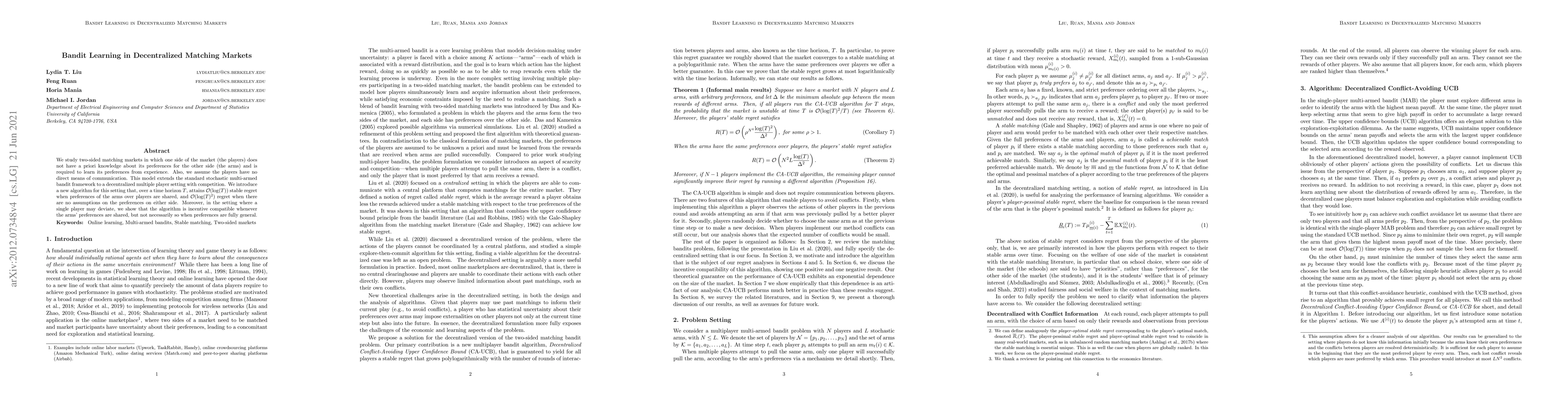 We study two-sided matching markets in which one side of the market (the players) does not have a priori knowledge about its preferences for the other side (the arms) and is required to learn its preferences from experience. Also, we assume the players have no direct means of communication. This model extends the standard stochastic multi-armed bandit framework to a decentralized multiple player setting with competition. We introduce a new algorithm for this setting that, over a time horizon $T$, attains $\mathcal{O}(\log(T))$ stable regret when preferences of the arms over players are shared, and $\mathcal{O}(\log(T)^2)$ regret when there are no assumptions on the preferences on either side. Moreover, in the setting where a single player may deviate, we show that the algorithm is incentive compatible whenever the arms' preferences are shared, but not necessarily so when preferences are fully general.