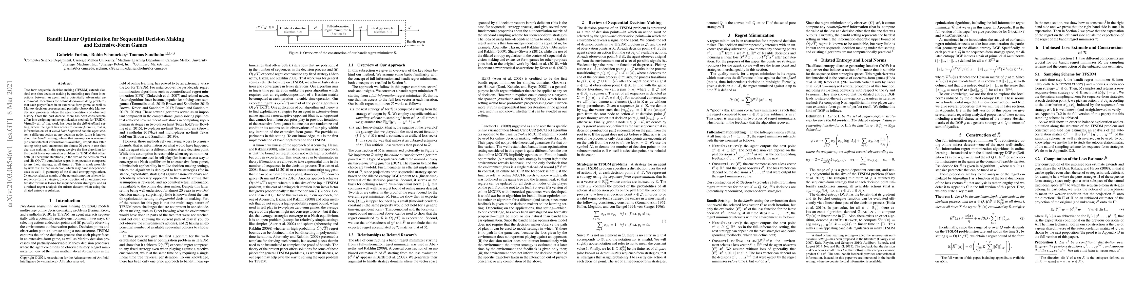 This paper introduces the first algorithm for bandit linear optimization in tree-form sequential decision making (TFSDM), achieving linear-time iterations and $O(\sqrt{T})$ cumulative regret. The work also provides new theoretical results on the geometry of the dilated entropy regularizer, autocorrelation matrix, and unbiased estimators for linear losses in sequence-form strategies.