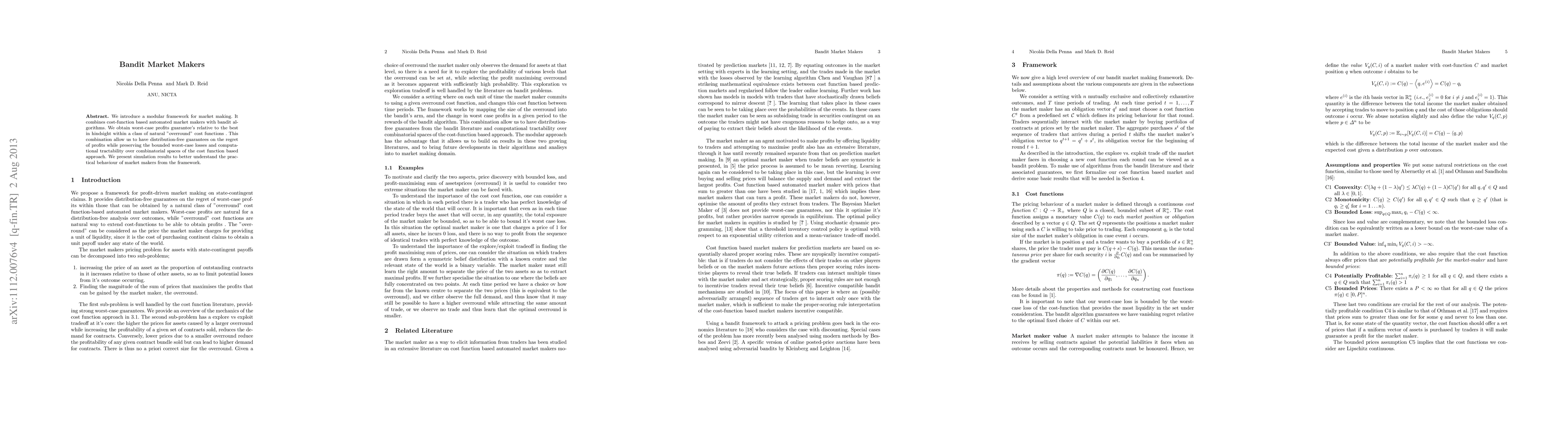 We introduce a modular framework for market making. It combines cost-function based automated market makers with bandit algorithms. We obtain worst-case profits guarantee's relative to the best in hindsight within a class of natural "overround" cost functions . This combination allow us to have distribution-free guarantees on the regret of profits while preserving the bounded worst-case losses and computational tractability over combinatorial spaces of the cost function based approach. We present simulation results to better understand the practical behaviour of market makers from the framework.