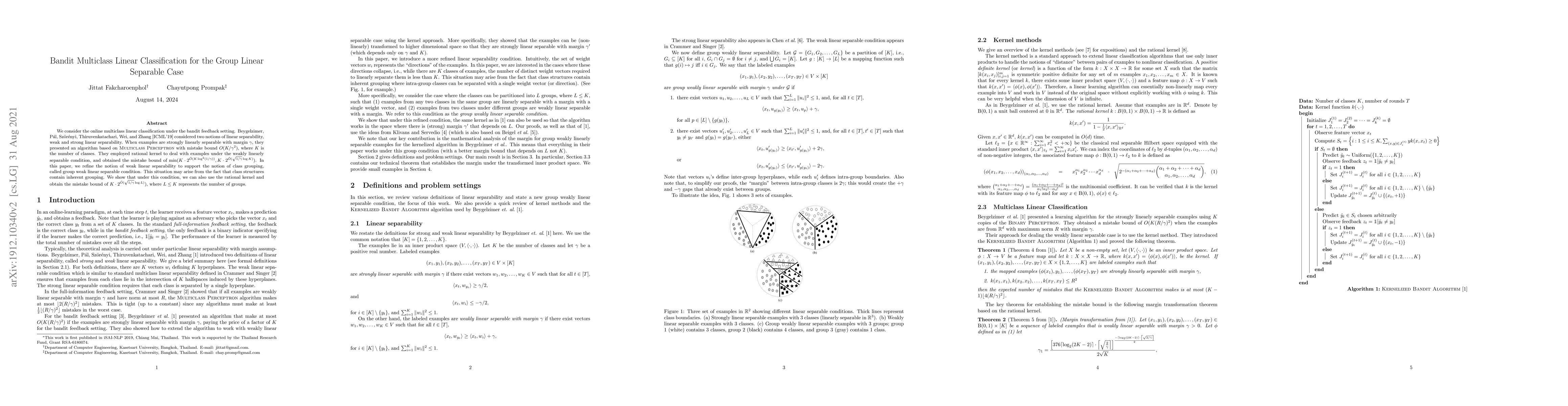 We consider the online multiclass linear classification under the bandit feedback setting. Beygelzimer, P\'{a}l, Sz\"{o}r\'{e}nyi, Thiruvenkatachari, Wei, and Zhang [ICML'19] considered two notions of linear separability, weak and strong linear separability. When examples are strongly linearly separable with margin $\gamma$, they presented an algorithm based on Multiclass Perceptron with mistake bound $O(K/\gamma^2)$, where $K$ is the number of classes. They employed rational kernel to deal with examples under the weakly linearly separable condition, and obtained the mistake bound of $\min(K\cdot 2^{\tilde{O}(K\log^2(1/\gamma))},K\cdot 2^{\tilde{O}(\sqrt{1/\gamma}\log K)})$. In this paper, we refine the notion of weak linear separability to support the notion of class grouping, called group weak linear separable condition. This situation may arise from the fact that class structures contain inherent grouping. We show that under this condition, we can also use the rational kernel and obtain the mistake bound of $K\cdot 2^{\tilde{O}(\sqrt{1/\gamma}\log L)})$, where $L\leq K$ represents the number of groups.