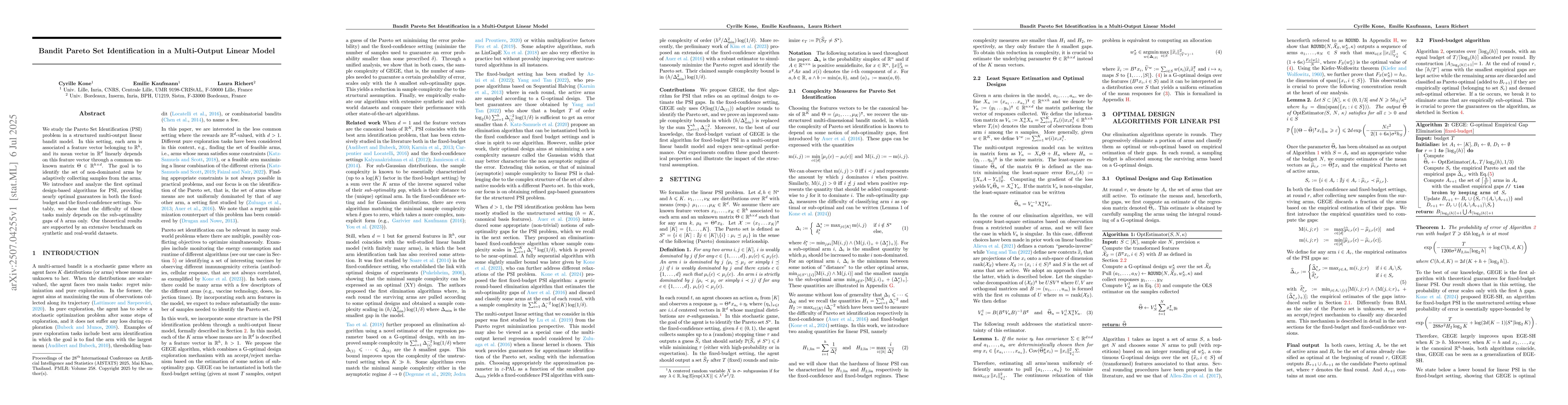 We study the Pareto Set Identification (PSI) problem in a structured multi-output linear bandit model. In this setting, each arm is associated a feature vector belonging to $\mathbb{R}^h$, and its mean vector in $\mathbb{R}^d$ linearly depends on this feature vector through a common unknown matrix $\Theta \in \mathbb{R}^{h \times d}$. The goal is to identify the set of non-dominated arms by adaptively collecting samples from the arms. We introduce and analyze the first optimal design-based algorithms for PSI, providing nearly optimal guarantees in both the fixed-budget and the fixed-confidence settings. Notably, we show that the difficulty of these tasks mainly depends on the sub-optimality gaps of $h$ arms only. Our theoretical results are supported by an extensive benchmark on synthetic and real-world datasets.