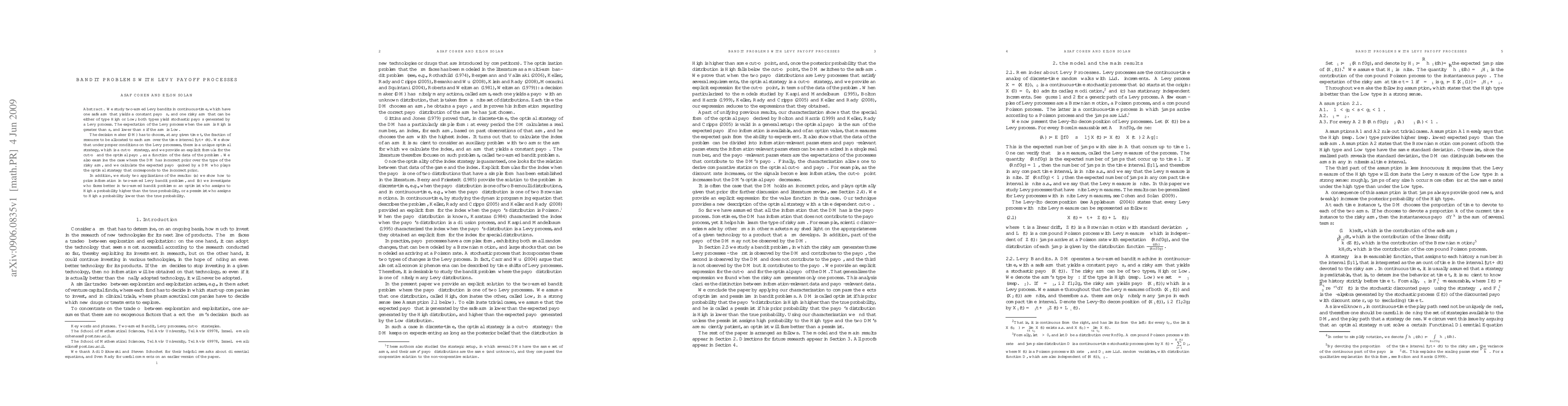 We study two-armed Levy bandits in continuous-time, which have one safe arm that yields a constant payoff s, and one risky arm that can be either of type High or Low; both types yield stochastic payoffs generated by a Levy process. The expectation of the Levy process when the arm is High is greater than s, and lower than s if the arm is Low. The decision maker (DM) has to choose, at any given time t, the fraction of resource to be allocated to each arm over the time interval [t,t+dt). We show that under proper conditions on the Levy processes, there is a unique optimal strategy, which is a cut-off strategy, and we provide an explicit formula for the cut-off and the optimal payoff, as a function of the data of the problem. We also examine the case where the DM has incorrect prior over the type of the risky arm, and we calculate the expected payoff gained by a DM who plays the optimal strategy that corresponds to the incorrect prior. In addition, we study two applications of the results: (a) we show how to price information in two-armed Levy bandit problem, and (b) we investigate who fares better in two-armed bandit problems: an optimist who assigns to High a probability higher than the true probability, or a pessimist who assigns to High a probability lower than the true probability.