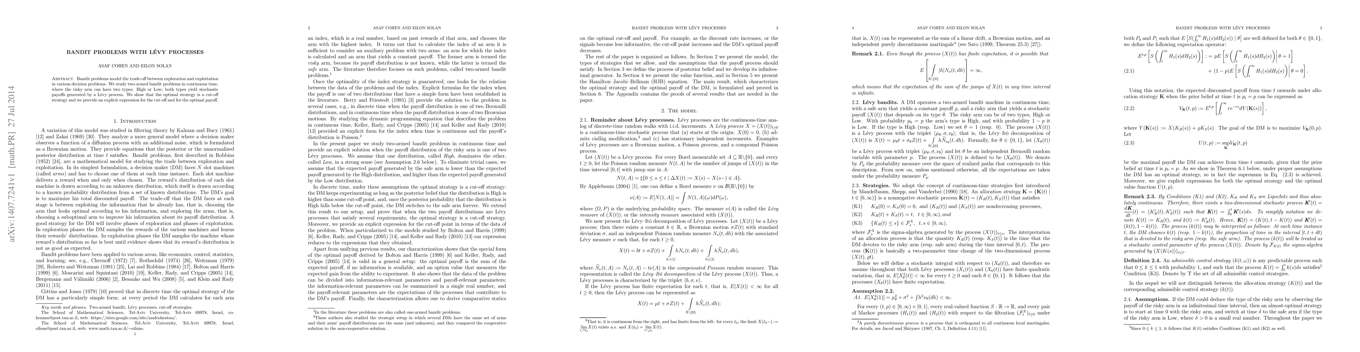 Bandit problems model the trade-off between exploration and exploitation in various decision problems. We study two-armed bandit problems in continuous time, where the risky arm can have two types: High or Low; both types yield stochastic payoffs generated by a Levy process. We show that the optimal strategy is a cut-off strategy and we provide an explicit expression for the cut-off and for the optimal payoff.