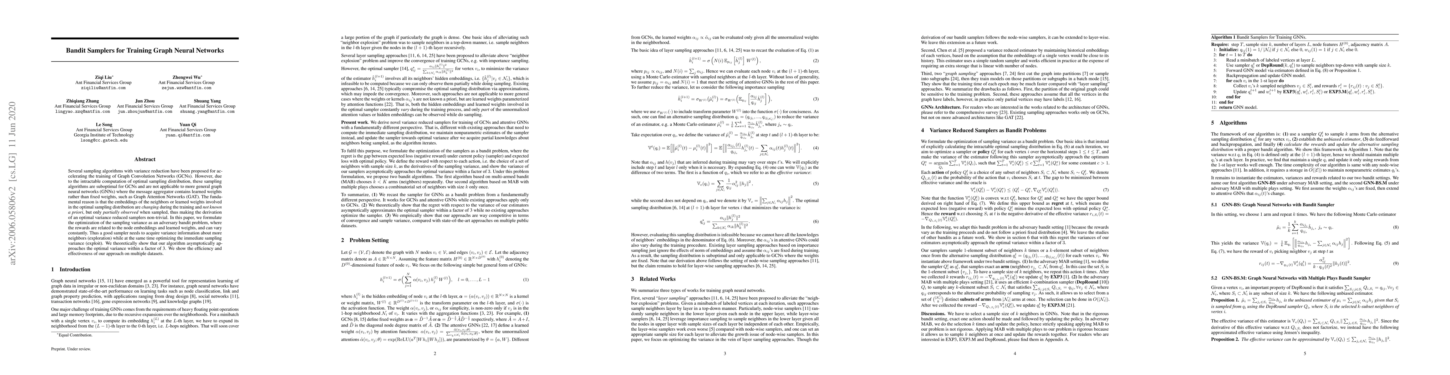 This paper proposes a bandit sampler to optimize the training of Graph Neural Networks (GNNs) by addressing the challenge of deriving optimal sampling distributions due to changing node embeddings and learned weights. The algorithm balances exploration and exploitation to minimize sampling variance, demonstrating efficiency and effectiveness across multiple datasets.