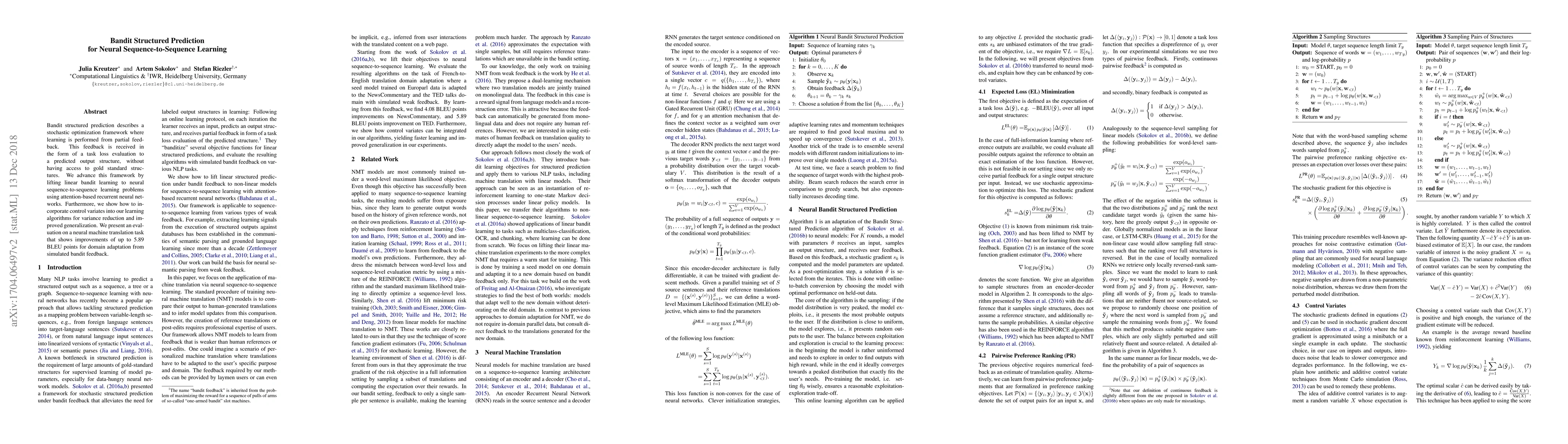 This paper proposes a neural sequence-to-sequence learning approach that employs bandit structured prediction and attention-based RNNs for optimizing models based on partial feedback. It also incorporates control variates for variance reduction, achieving notable improvements in neural machine translation performance.