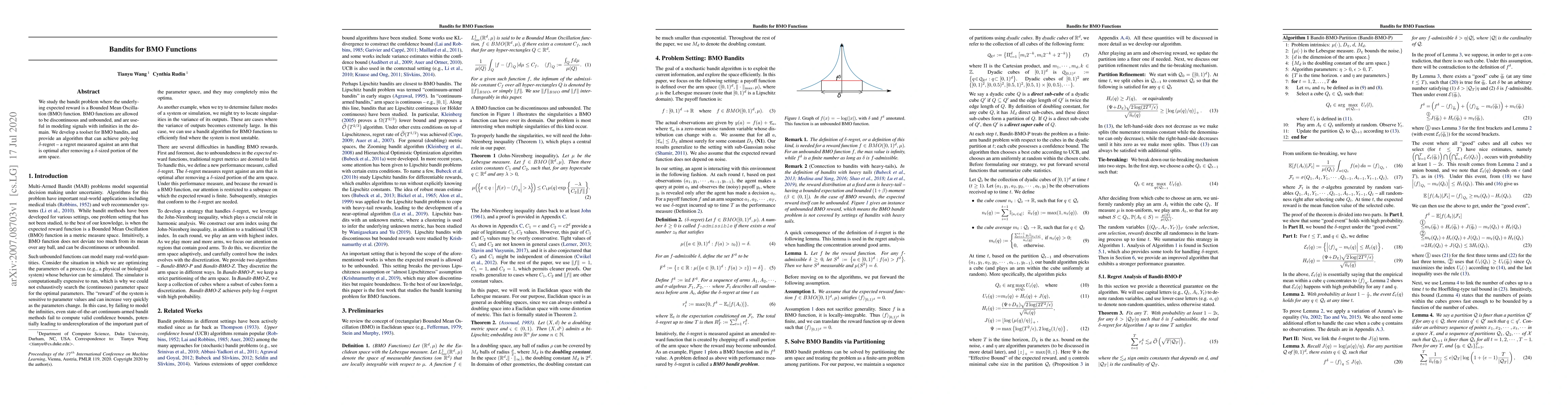 We study the bandit problem where the underlying expected reward is a Bounded Mean Oscillation (BMO) function. BMO functions are allowed to be discontinuous and unbounded, and are useful in modeling signals with infinities in the do-main. We develop a toolset for BMO bandits, and provide an algorithm that can achieve poly-log $\delta$-regret -- a regret measured against an arm that is optimal after removing a $\delta$-sized portion of the arm space.