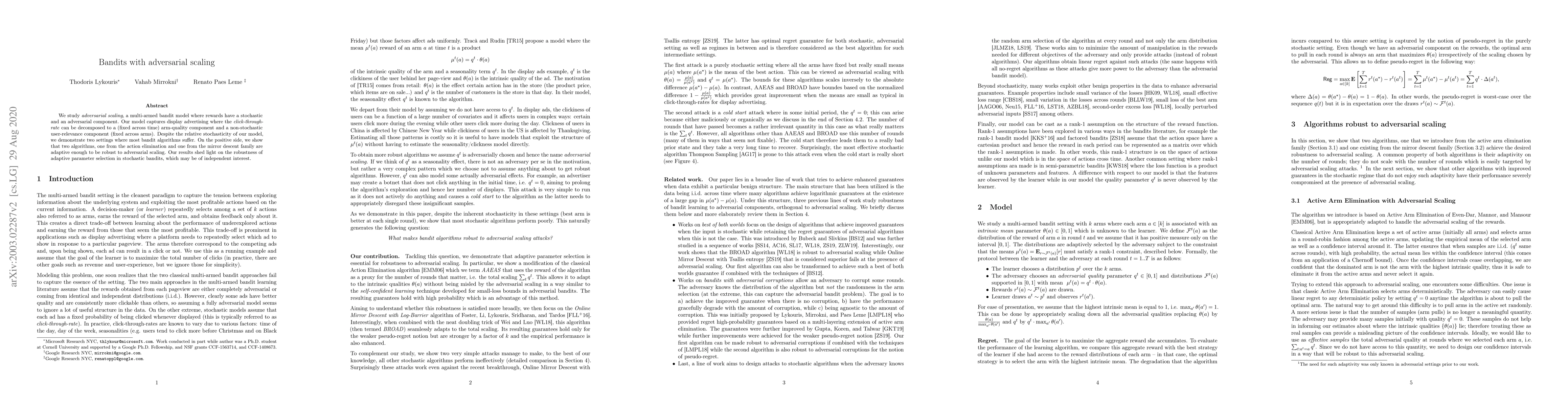 This paper explores "adversarial scaling" in multi-armed bandit models, where rewards consist of both stochastic and adversarial components, relevant to display advertising. It identifies two algorithms—one from action elimination and one from mirror descent—that effectively handle this complexity, highlighting the robustness of adaptive parameter selection in stochastic bandits.