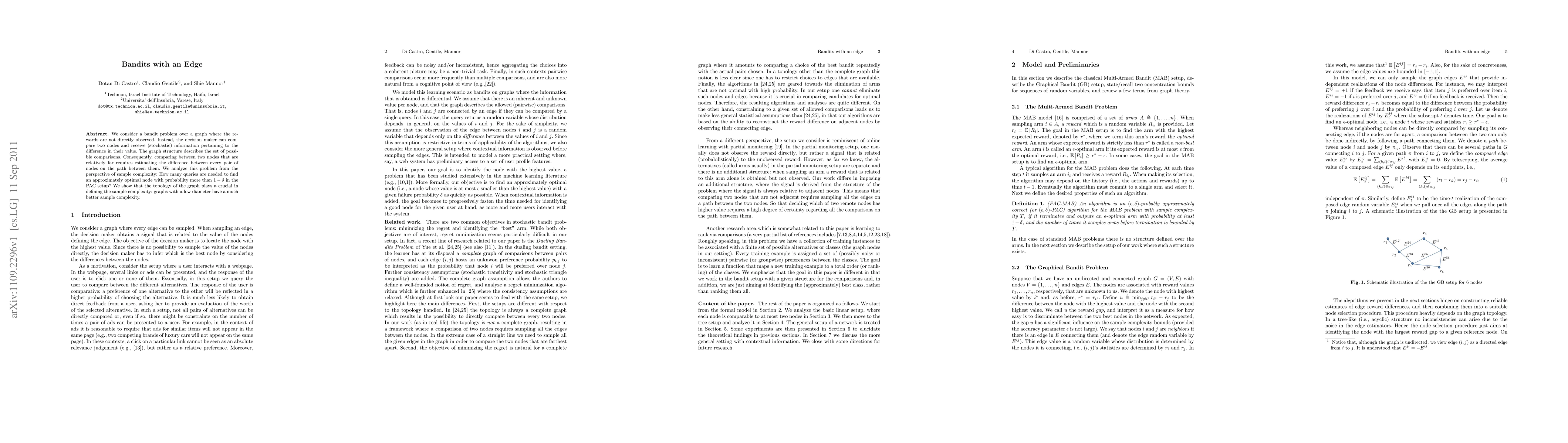 We consider a bandit problem over a graph where the rewards are not directly observed. Instead, the decision maker can compare two nodes and receive (stochastic) information pertaining to the difference in their value. The graph structure describes the set of possible comparisons. Consequently, comparing between two nodes that are relatively far requires estimating the difference between every pair of nodes on the path between them. We analyze this problem from the perspective of sample complexity: How many queries are needed to find an approximately optimal node with probability more than $1-\delta$ in the PAC setup? We show that the topology of the graph plays a crucial in defining the sample complexity: graphs with a low diameter have a much better sample complexity.