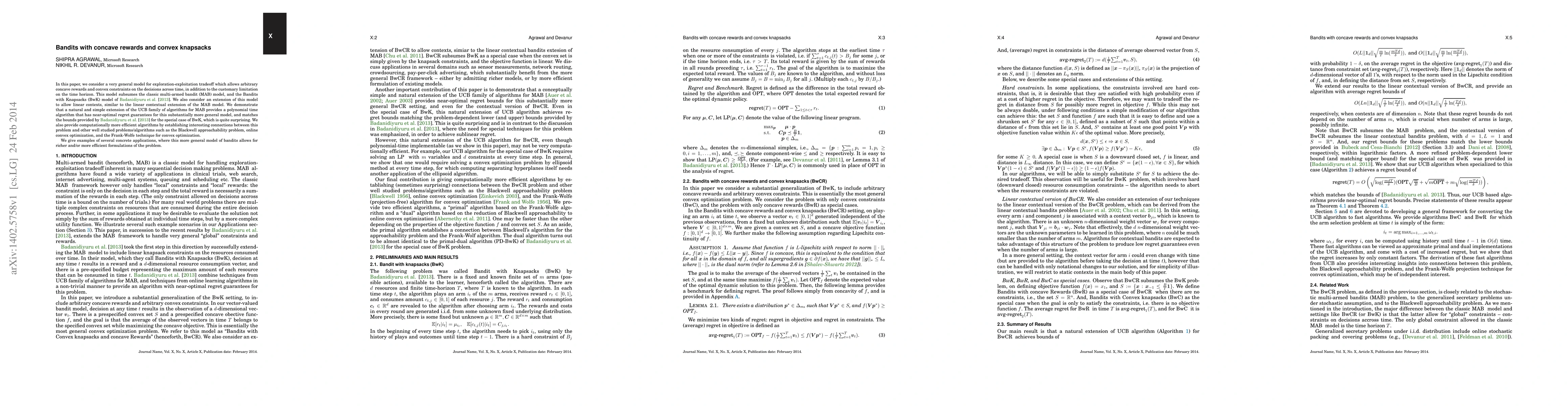 In this paper, we consider a very general model for exploration-exploitation tradeoff which allows arbitrary concave rewards and convex constraints on the decisions across time, in addition to the customary limitation on the time horizon. This model subsumes the classic multi-armed bandit (MAB) model, and the Bandits with Knapsacks (BwK) model of Badanidiyuru et al.[2013]. We also consider an extension of this model to allow linear contexts, similar to the linear contextual extension of the MAB model. We demonstrate that a natural and simple extension of the UCB family of algorithms for MAB provides a polynomial time algorithm that has near-optimal regret guarantees for this substantially more general model, and matches the bounds provided by Badanidiyuru et al.[2013] for the special case of BwK, which is quite surprising. We also provide computationally more efficient algorithms by establishing interesting connections between this problem and other well studied problems/algorithms such as the Blackwell approachability problem, online convex optimization, and the Frank-Wolfe technique for convex optimization. We give examples of several concrete applications, where this more general model of bandits allows for richer and/or more efficient formulations of the problem.