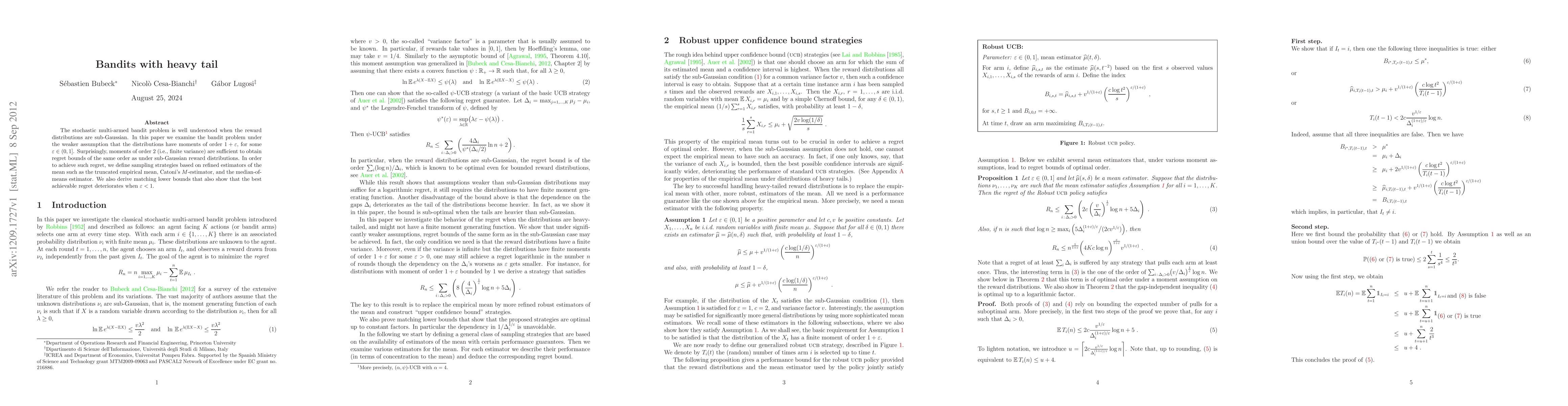 The stochastic multi-armed bandit problem is well understood when the reward distributions are sub-Gaussian. In this paper we examine the bandit problem under the weaker assumption that the distributions have moments of order 1+\epsilon, for some $\epsilon \in (0,1]$. Surprisingly, moments of order 2 (i.e., finite variance) are sufficient to obtain regret bounds of the same order as under sub-Gaussian reward distributions. In order to achieve such regret, we define sampling strategies based on refined estimators of the mean such as the truncated empirical mean, Catoni's M-estimator, and the median-of-means estimator. We also derive matching lower bounds that also show that the best achievable regret deteriorates when \epsilon <1.
