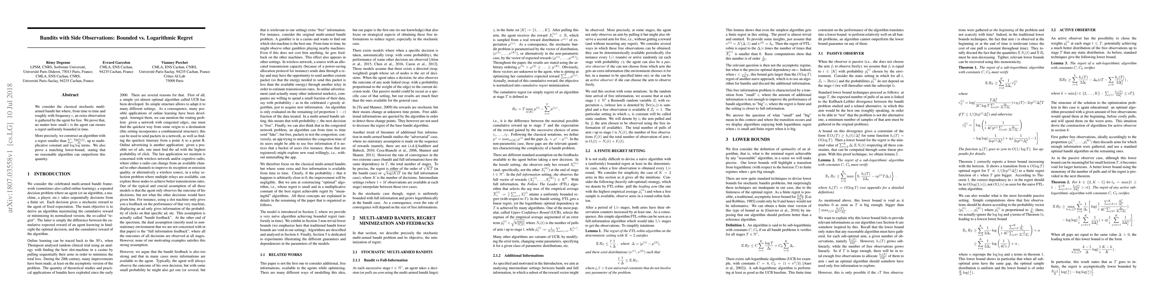 This paper explores a stochastic multi-armed bandit problem with occasional free observations. It presents an algorithm ensuring bounded regret, proving a regret bound of $\sum_i \frac{\log(1/\epsilon)}{\Delta_i}$ and establishes a matching lower-bound, demonstrating optimal performance.