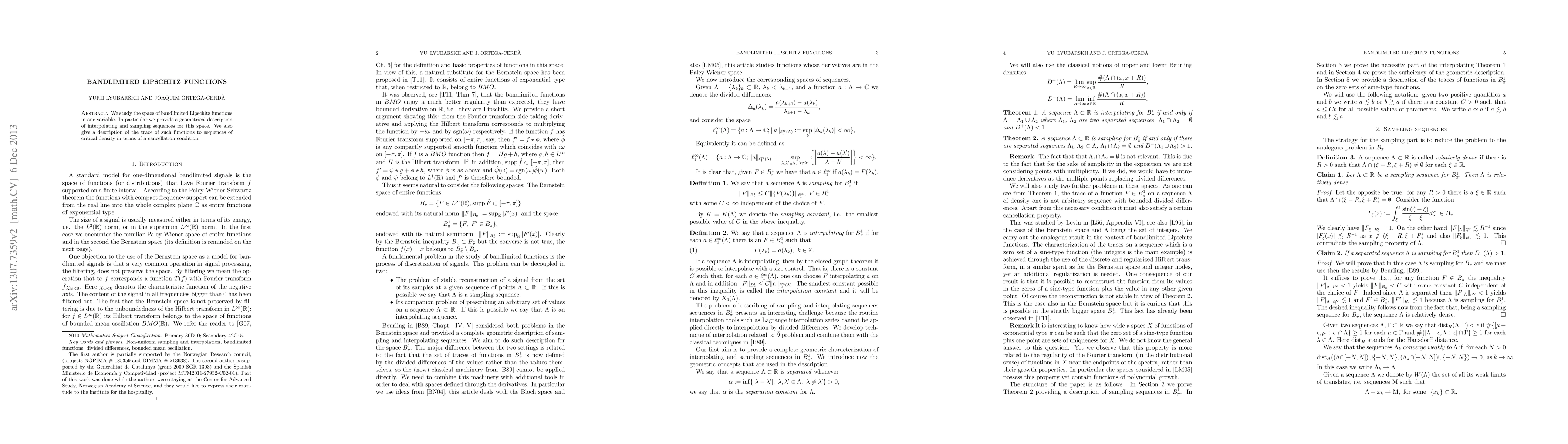 This research paper explores bandlimited Lipschitz functions in one dimension, offering a geometrical description for their natural interpolating and sampling sequences. It also identifies a trace of such functions to critical density sequences through a cancellation condition.