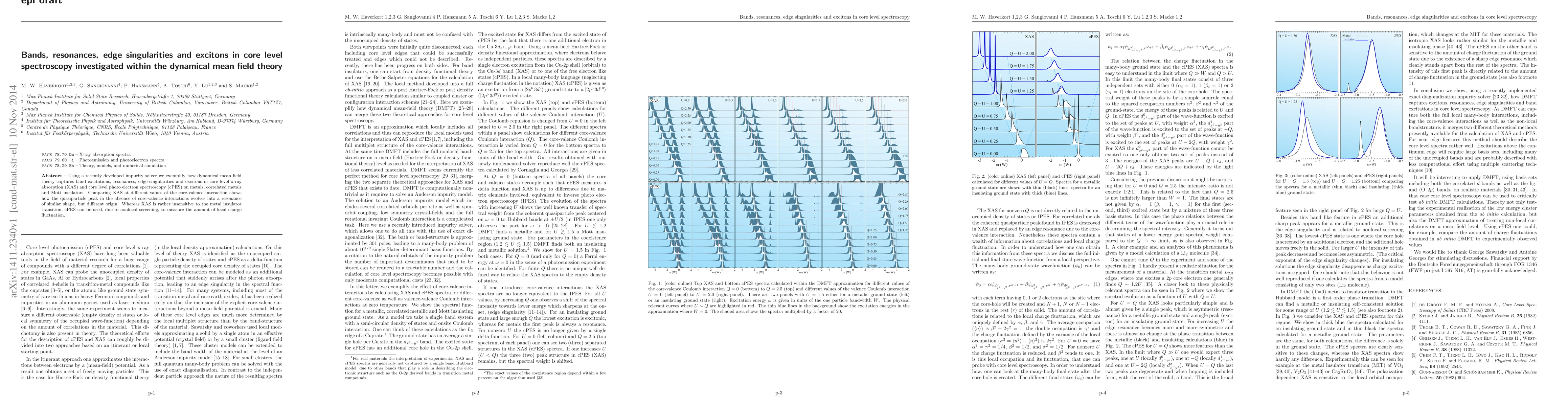 Using a recently developed impurity solver we exemplify how dynamical mean field theory captures band excitations, resonances, edge singularities and excitons in core level x-ray absorption (XAS) and core level photo electron spectroscopy (cPES) on metals, correlated metals and Mott insulators. Comparing XAS at different values of the core-valence interaction shows how the quasiparticle peak in the absence of core-valence interactions evolves into a resonance of similar shape, but different origin. Whereas XAS is rather insensitive to the metal insulator transition, cPES can be used, due to nonlocal screening, to measure the amount of local charge fluctuation.