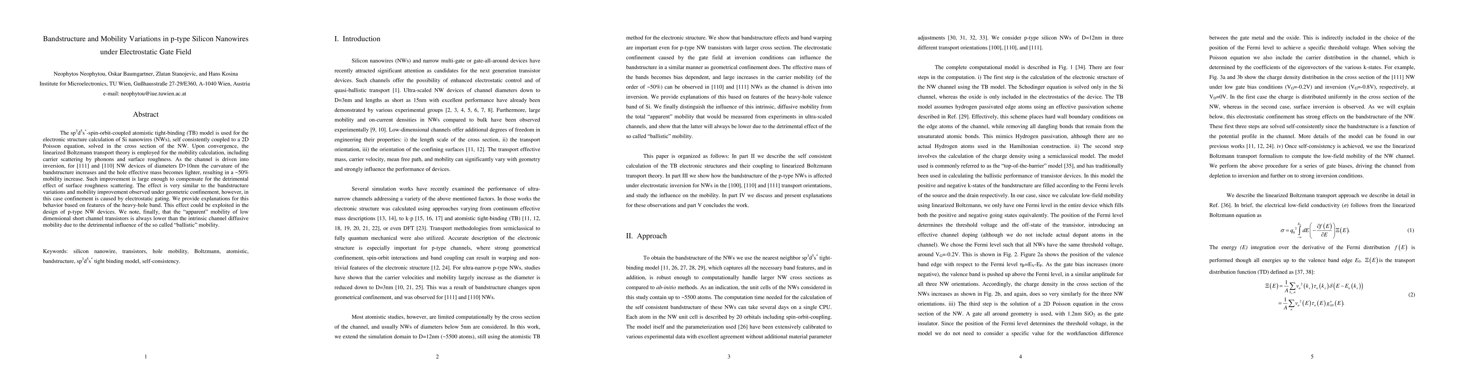 The sp3d5s*-spin-orbit-coupled atomistic tight-binding (TB) model is used for the electronic structure calculation of Si nanowires (NWs), self consistently coupled to a 2D Poisson equation, solved in the cross section of the NW. Upon convergence, the linearized Boltzmann transport theory is employed for the mobility calculation, including carrier scattering by phonons and surface roughness. As the channel is driven into inversion, for [111] and [110] NW devices of diameters D>10nm the curvature of the bandstructure increases and the hole effective mass becomes lighter, resulting in a approx. 50% mobility increase. Such improvement is large enough to compensate for the detrimental effect of surface roughness scattering. The effect is very similar to the bandstructure variations and mobility improvement observed under geometric confinement, however, in this case confinement is caused by electrostatic gating. We provide explanations for this behavior based on features of the heavy-hole band. This effect could be exploited in the design of p-type NW devices. We note, finally, that the 'apparent' mobility of low dimensional short channel transistors is always lower than the intrinsic channel diffusive mobility due to the detrimental influence of the so called 'ballistic' mobility.