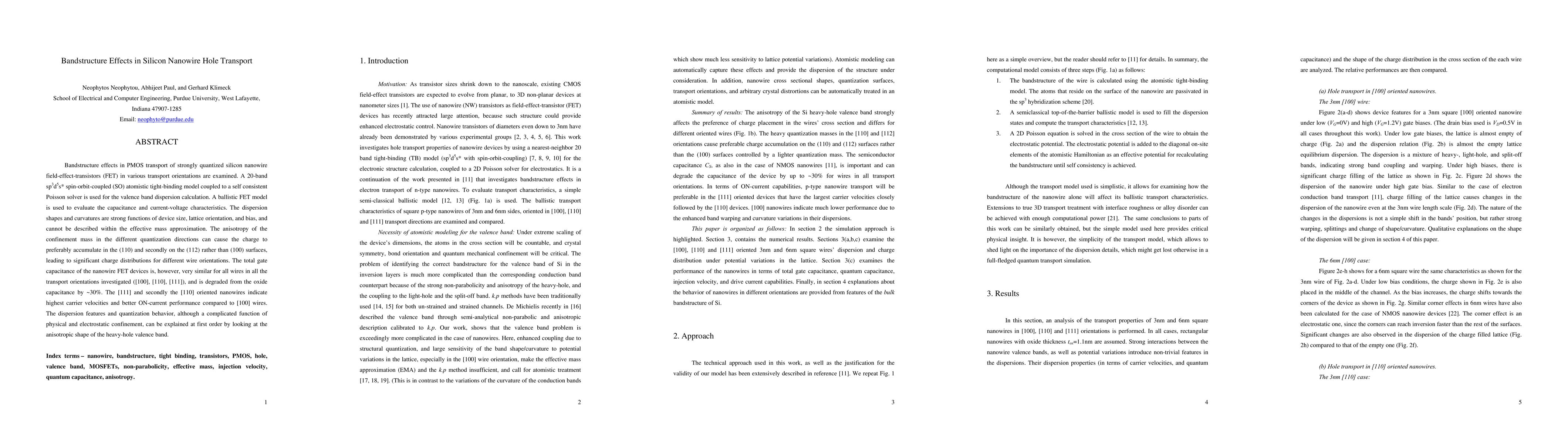 This paper investigates bandstructure effects in PMOS transport within silicon nanowire FETs, revealing that the dispersion shapes and curvatures depend heavily on device size, orientation, and bias. The study finds that carrier velocities and ON-current performance are highest for [111] and [110] oriented nanowires due to anisotropic confinement mass.