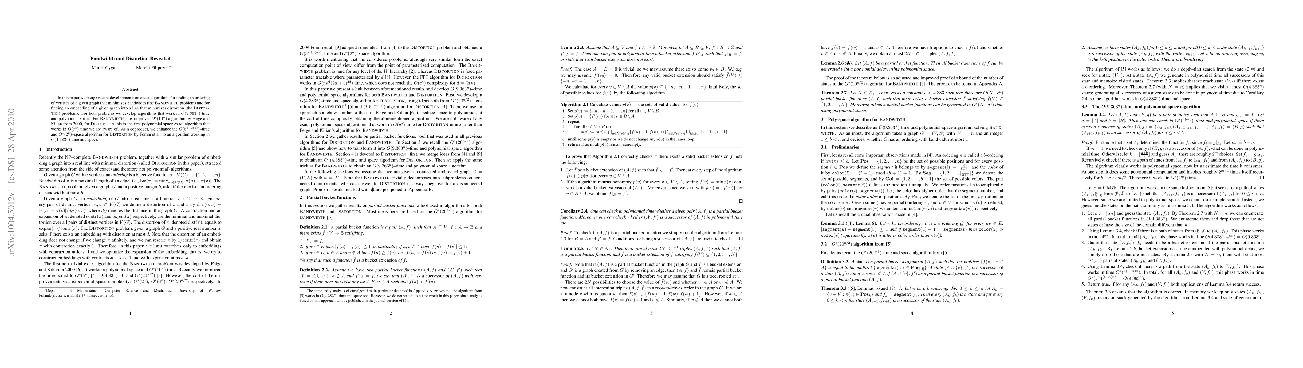 In this paper we merge recent developments on exact algorithms for finding an ordering of vertices of a given graph that minimizes bandwidth (the BANDWIDTH problem) and for finding an embedding of a given graph into a line that minimizes distortion (the DISTORTION problem). For both problems we develop algorithms that work in O(9.363^n) time and polynomial space. For BANDWIDTH, this improves O^*(10^n) algorithm by Feige and Kilian from 2000, for DISTORTION this is the first polynomial space exact algorithm that works in O(c^n) time we are aware of. As a byproduct, we enhance the O(5^{n+o(n)})-time and O^*(2^n)-space algorithm for DISTORTION by Fomin et al. to an algorithm working in O(4.383^n) time and space.