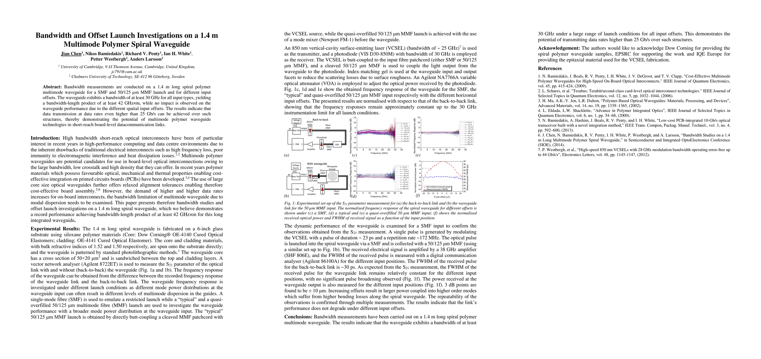 This study investigates the bandwidth and offset performance of a 1.4 m multimode polymer spiral waveguide, showing a bandwidth of at least 30 GHz for various launches and offsets, indicating potential for high-speed data transmission over short distances.