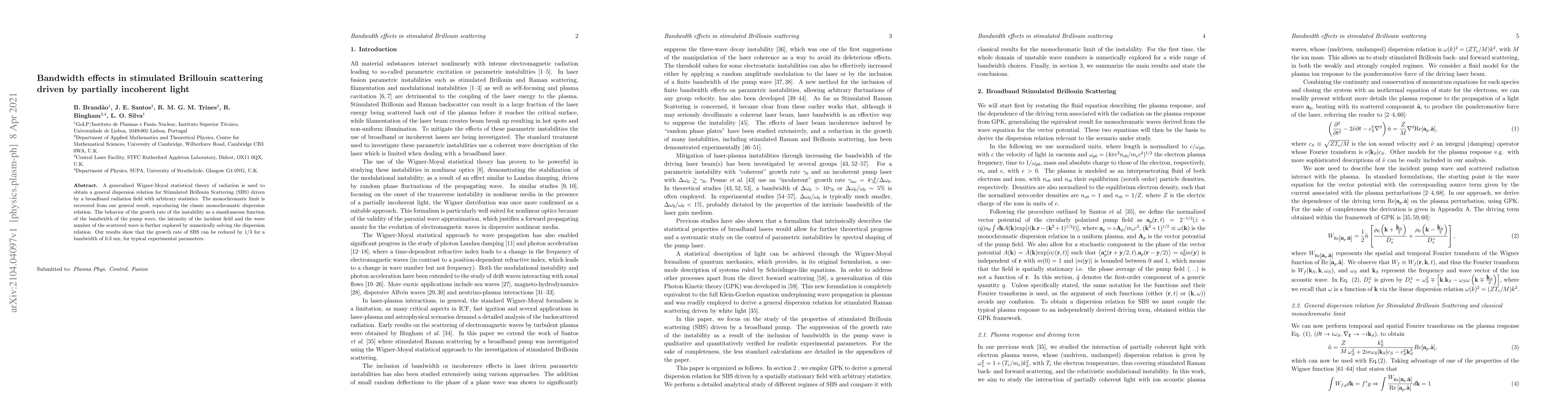 A generalized Wigner-Moyal statistical theory of radiation is used to obtain a general dispersion relation for Stimulated Brillouin Scattering (SBS) driven by a broadband radiation field with arbitrary statistics. The monochromatic limit is recovered from our general result, reproducing the classic monochromatic dispersion relation. The behavior of the growth rate of the instability as a simultaneous function of the bandwidth of the pump wave, the intensity of the incident field and the wave number of the scattered wave is further explored by numerically solving the dispersion relation. Our results show that the growth rate of SBS can be reduced by 1/3 for a bandwidth of 0.3 nm, for typical experimental parameters.