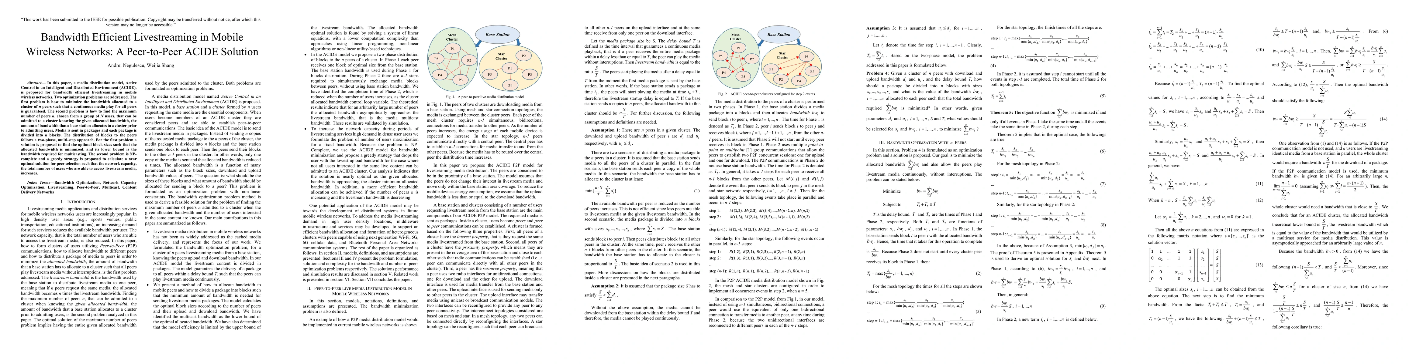 This paper proposes an ACIDE model for bandwidth-efficient livestreaming in mobile networks, addressing two optimization problems: minimizing bandwidth allocation for continuous media playback and finding the maximum number of peers that can be admitted within a given bandwidth. A two-phase, multi-step approach optimizes block distribution, with a greedy strategy for peer selection to maximize network capacity.