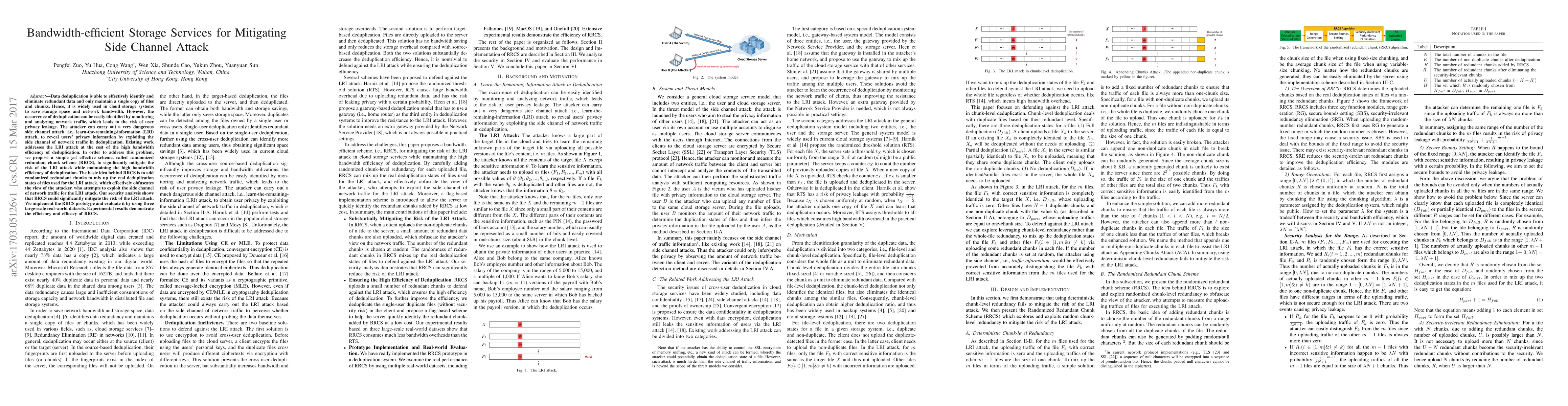 This paper proposes a randomized redundant chunk scheme (RRCS) to mitigate learn-the-remaining-information (LRI) side channel attacks in data deduplication while preserving bandwidth efficiency. RRCS adds randomized redundant chunks to obfuscate deduplication states, effectively thwarting attackers without compromising deduplication benefits.