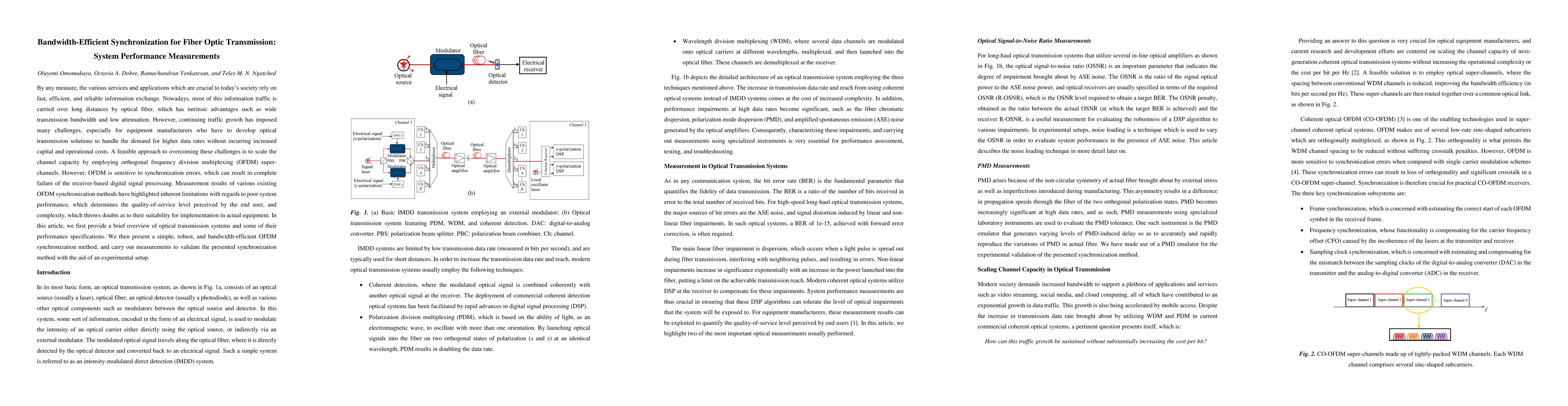This paper introduces a robust, bandwidth-efficient OFDM synchronization method for fiber optic transmission systems and validates its performance through experimental measurements. The study aims to enhance the efficiency and reliability of optical data transmission.