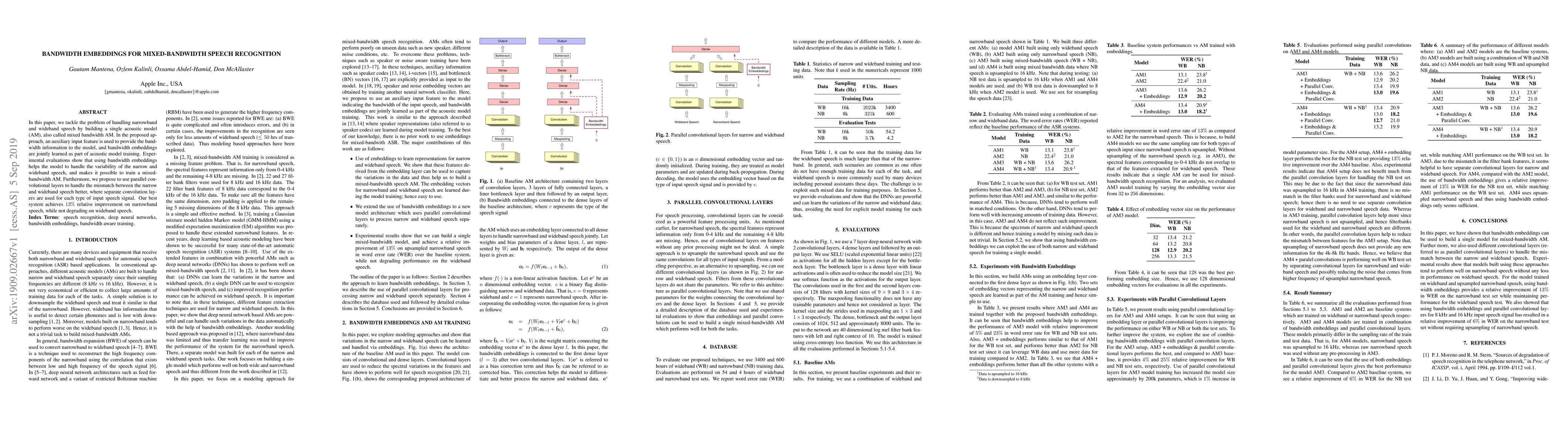 This paper proposes a method to build a single acoustic model for mixed-bandwidth speech recognition using bandwidth embeddings and parallel convolutional layers. The approach achieves a 13% relative improvement for narrowband speech without affecting wideband speech performance.