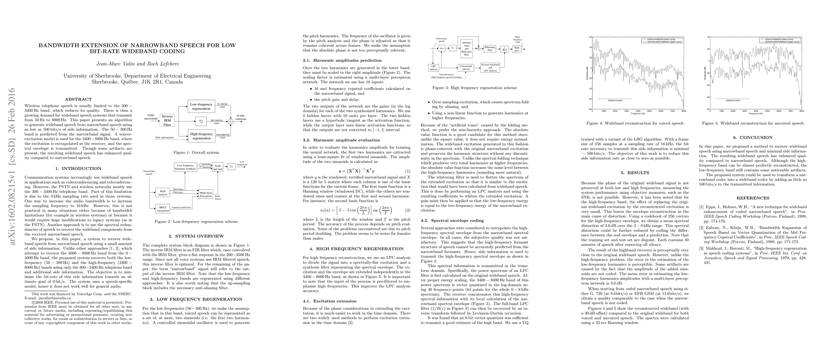 This paper proposes an algorithm for extending narrowband speech to wideband using minimal side information, predicting the 50-300 Hz band and extrapolating the 3400-8000 Hz band at the receiver, resulting in enhanced speech quality despite some artifacts.