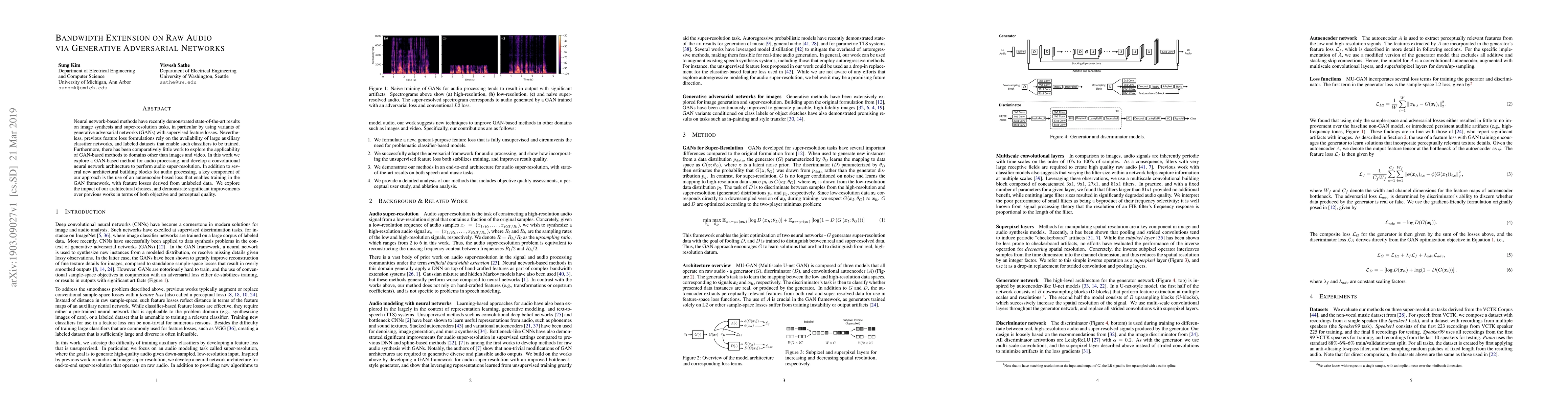 Neural network-based methods have recently demonstrated state-of-the-art results on image synthesis and super-resolution tasks, in particular by using variants of generative adversarial networks (GANs) with supervised feature losses. Nevertheless, previous feature loss formulations rely on the availability of large auxiliary classifier networks, and labeled datasets that enable such classifiers to be trained. Furthermore, there has been comparatively little work to explore the applicability of GAN-based methods to domains other than images and video. In this work we explore a GAN-based method for audio processing, and develop a convolutional neural network architecture to perform audio super-resolution. In addition to several new architectural building blocks for audio processing, a key component of our approach is the use of an autoencoder-based loss that enables training in the GAN framework, with feature losses derived from unlabeled data. We explore the impact of our architectural choices, and demonstrate significant improvements over previous works in terms of both objective and perceptual quality.