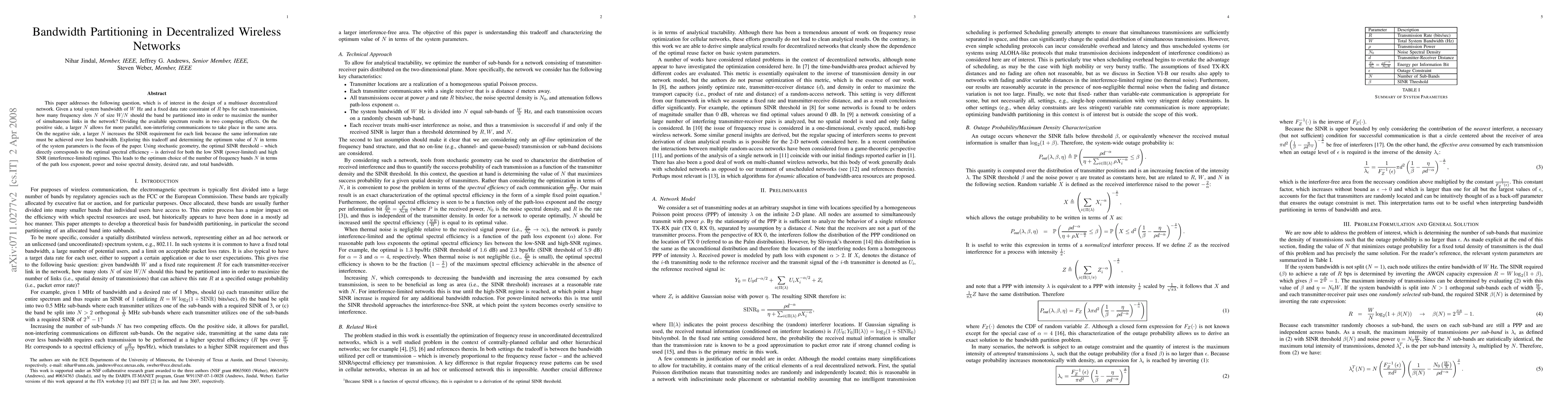 The paper finds that in a decentralized wireless network, dividing the bandwidth into N frequency slots of size W/N maximizes simultaneous links by balancing interference and parallel communication. The optimal value of N depends on system parameters such as path loss exponent, power, and noise spectral density.