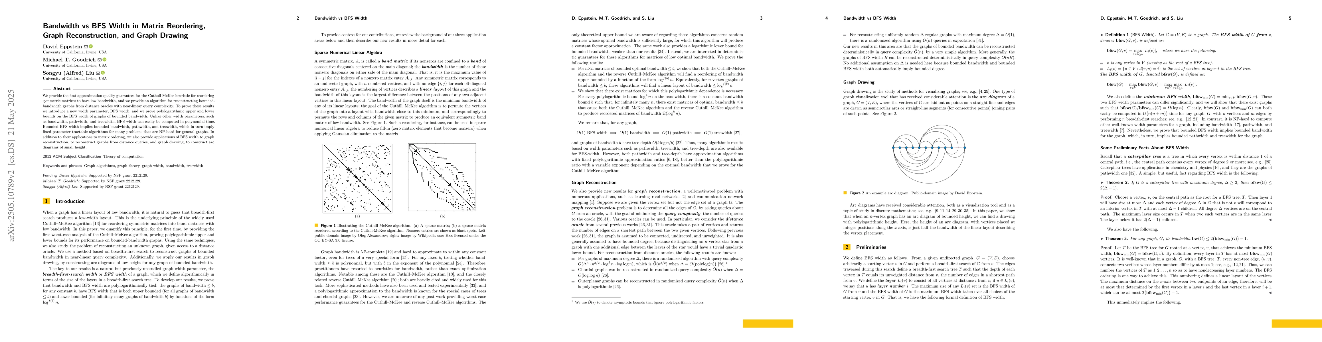 The paper introduces a new width parameter, BFS width, to analyze and compare the approximation quality of the Cuthull-McKee heuristic for matrix reordering and the reconstruction of bounded-bandwidth graphs from distance oracles.