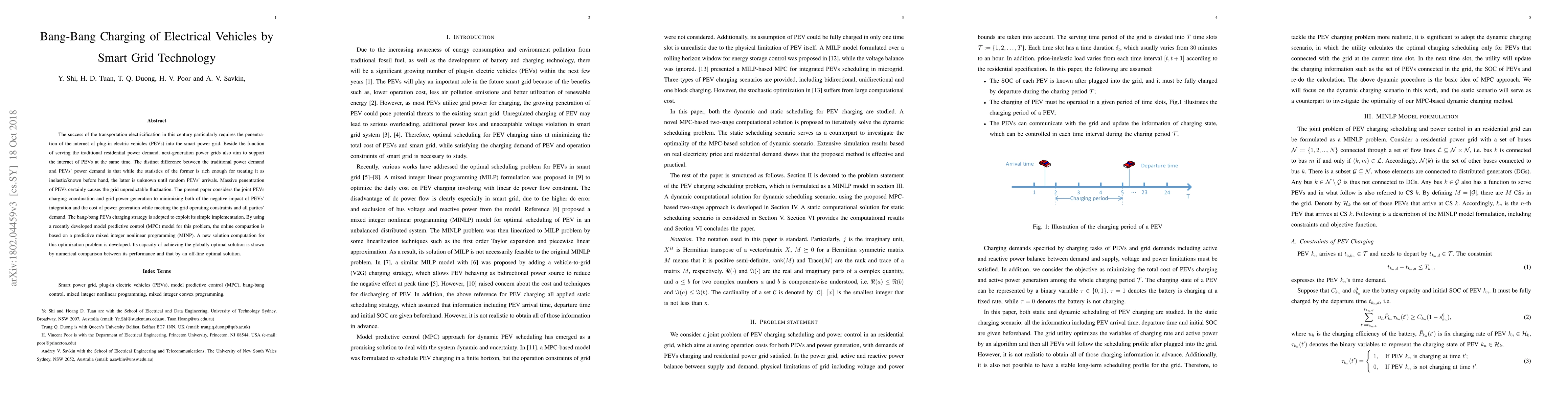 This paper proposes a new charging strategy for electric vehicles that minimizes grid power generation costs while meeting operating constraints and user demand, using a simple bang-bang approach with model predictive control.