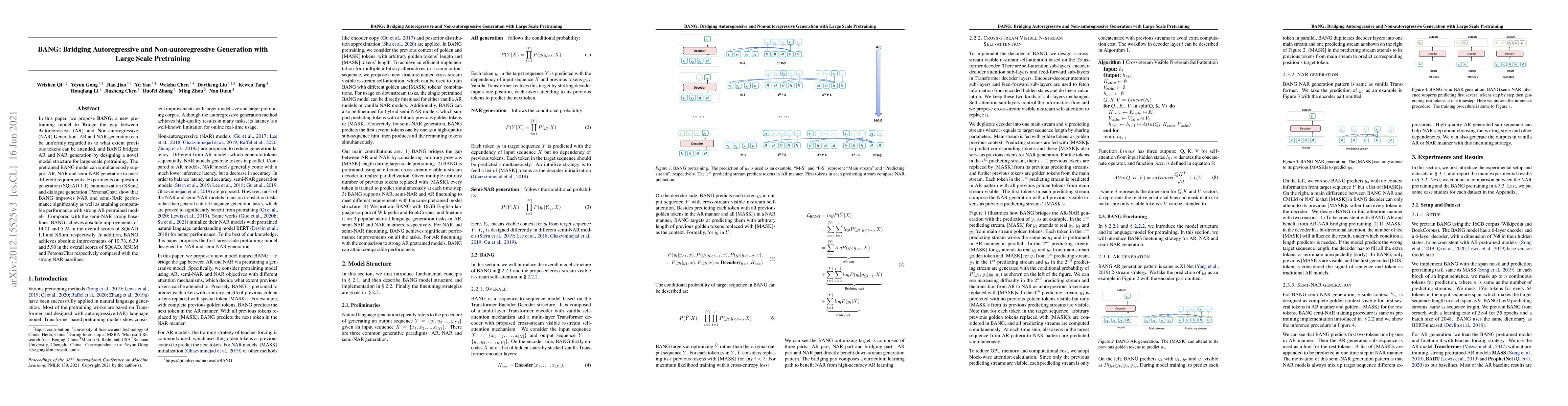 The paper introduces BANG, a pretraining model that bridges autoregressive and non-autoregressive generation by leveraging large-scale pretraining. BANG achieves significant improvements in non-autoregressive and semi-NAR tasks while maintaining competitive performance with autoregressive models.