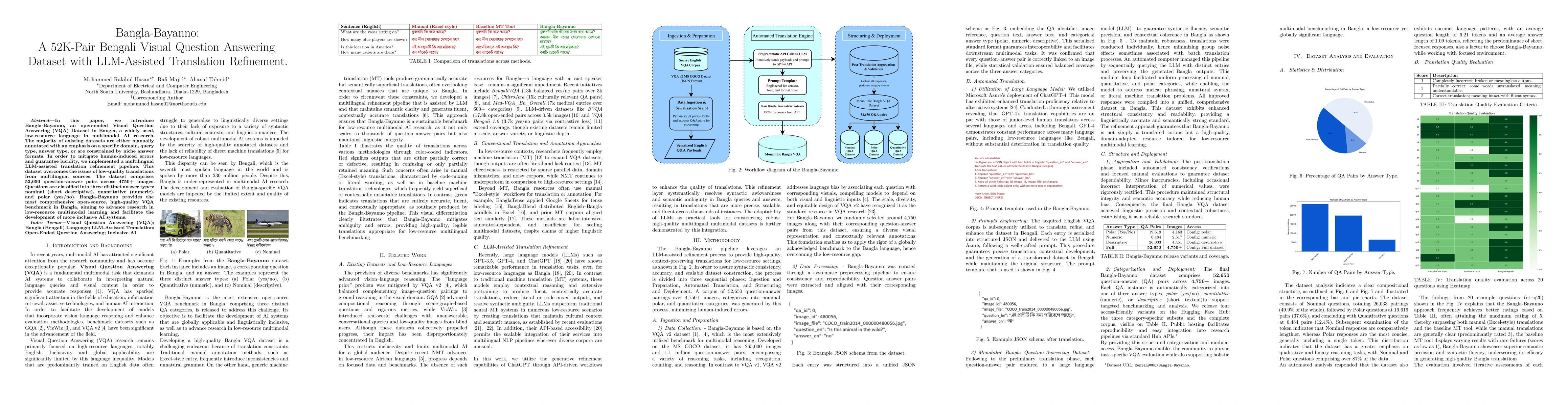 In this paper, we introduce Bangla-Bayanno, an open-ended Visual Question Answering (VQA) Dataset in Bangla, a widely used, low-resource language in multimodal AI research. The majority of existing datasets are either manually annotated with an emphasis on a specific domain, query type, or answer type or are constrained by niche answer formats. In order to mitigate human-induced errors and guarantee lucidity, we implemented a multilingual LLM-assisted translation refinement pipeline. This dataset overcomes the issues of low-quality translations from multilingual sources. The dataset comprises 52,650 question-answer pairs across 4750+ images. Questions are classified into three distinct answer types: nominal (short descriptive), quantitative (numeric), and polar (yes/no). Bangla-Bayanno provides the most comprehensive open-source, high-quality VQA benchmark in Bangla, aiming to advance research in low-resource multimodal learning and facilitate the development of more inclusive AI systems.