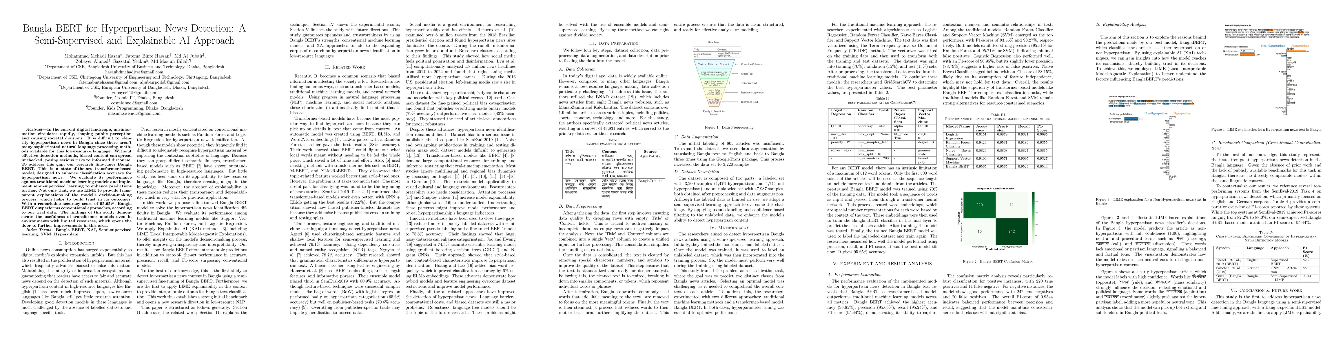 In the current digital landscape, misinformation circulates rapidly, shaping public perception and causing societal divisions. It is difficult to identify hyperpartisan news in Bangla since there aren't many sophisticated natural language processing methods available for this low-resource language. Without effective detection methods, biased content can spread unchecked, posing serious risks to informed discourse. To address this gap, our research fine-tunes Bangla BERT. This is a state-of-the-art transformer-based model, designed to enhance classification accuracy for hyperpartisan news. We evaluate its performance against traditional machine learning models and implement semi-supervised learning to enhance predictions further. Not only that, we use LIME to provide transparent explanations of the model's decision-making process, which helps to build trust in its outcomes. With a remarkable accuracy score of 95.65%, Bangla BERT outperforms conventional approaches, according to our trial data. The findings of this study demonstrate the usefulness of transformer models even in environments with limited resources, which opens the door to further improvements in this area.
