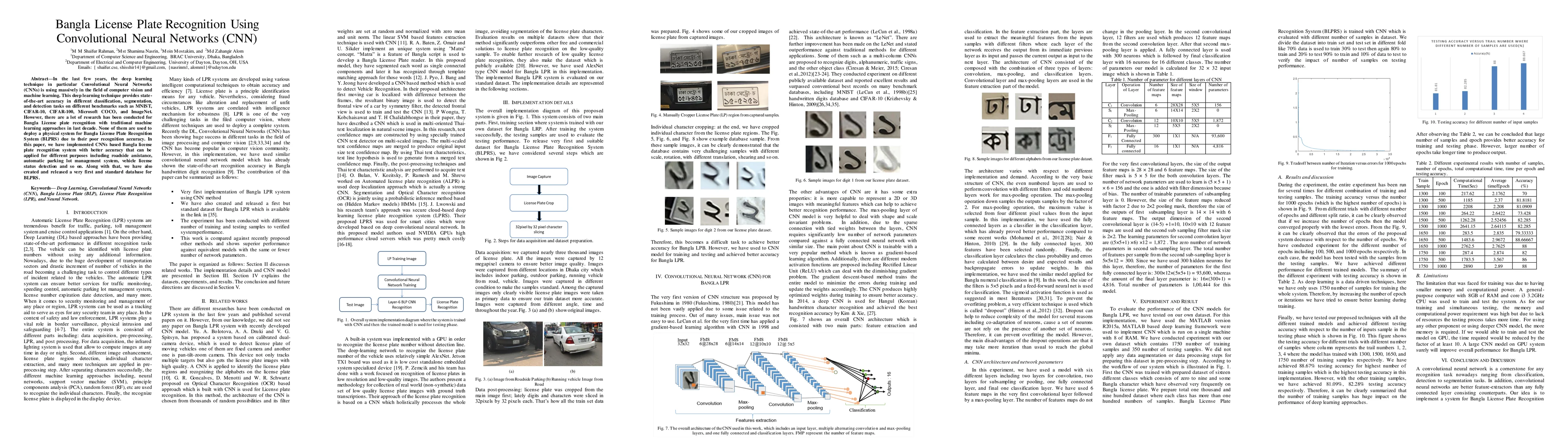 This paper implements a Convolutional Neural Network (CNN) for Bangla License Plate Recognition, achieving higher accuracy compared to traditional machine learning methods. The authors also release the first standard database for this purpose, enabling applications like roadside assistance and automatic parking management.