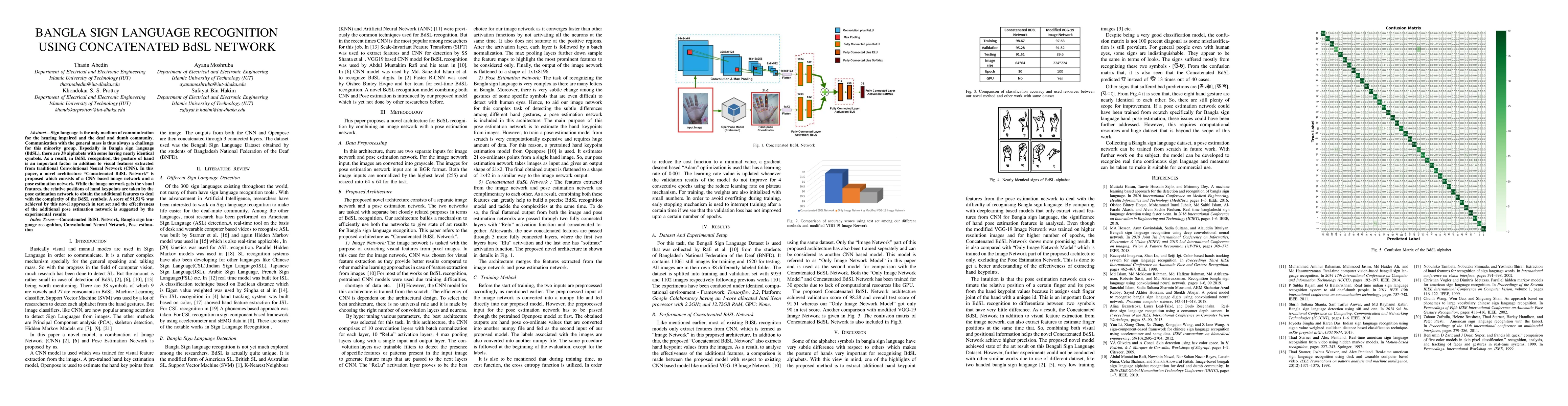 This paper proposes a "Concatenated BdSL Network" for Bangla sign language recognition, combining a CNN-based image network with a pose estimation network to extract visual and hand posture features, achieving a 91.51% accuracy rate and demonstrating the effectiveness of pose estimation in handling complex BdSL symbols.