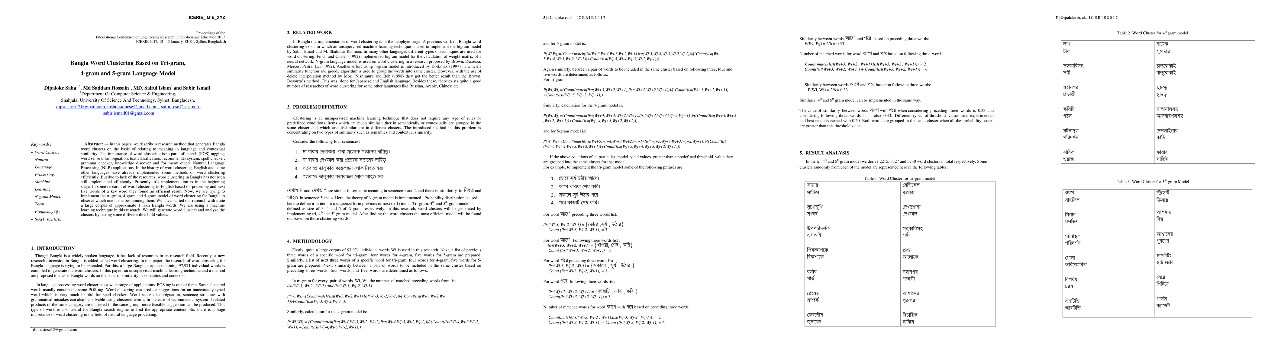 This paper explores Bangla word clustering using tri-gram, 4-gram, and 5-gram language models to enhance NLP applications like POS tagging and text classification. The study aims to determine the most effective model for Bangla, leveraging a large corpus of approximately 1 lakh words and machine learning techniques.