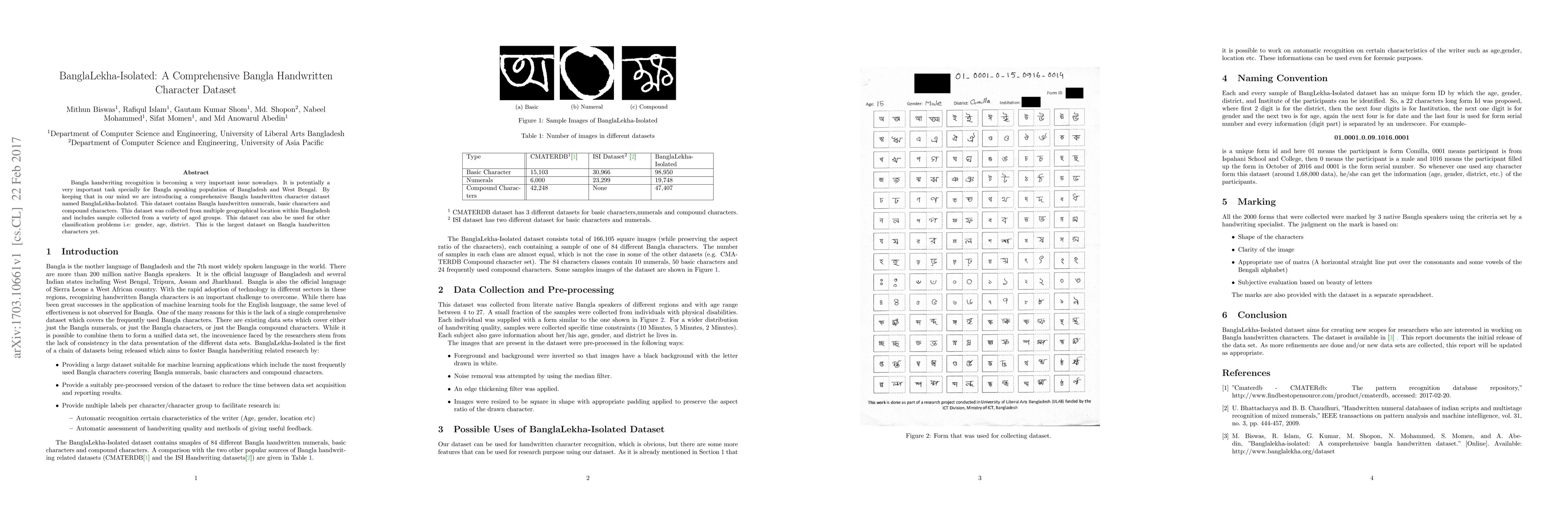 The paper introduces BanglaLekha-Isolated, a comprehensive dataset for Bangla handwritten characters, including numerals, basic, and compound characters, collected from diverse geographical and age groups in Bangladesh. This dataset is the largest of its kind and can also be used for additional classification tasks like gender, age, and district.