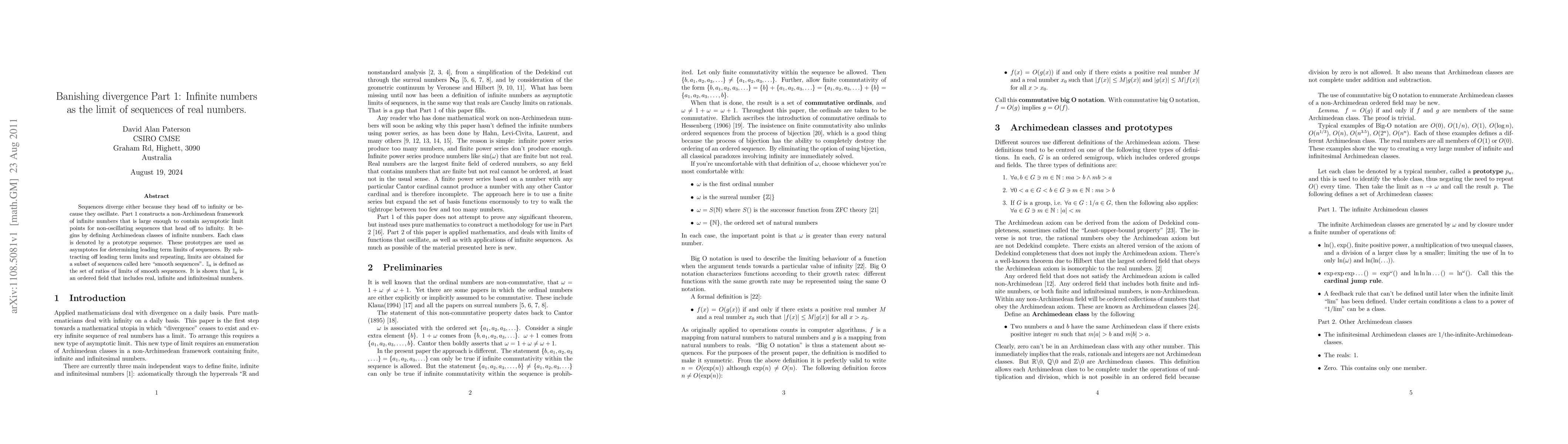 Sequences diverge either because they head off to infinity or because they oscillate. Part 1 constructs a non-Archimedean framework of infinite numbers that is large enough to contain asymptotic limit points for non-oscillating sequences that head off to infinity. It begins by defining Archimedean classes of infinite numbers. Each class is denoted by a prototype sequence. These prototypes are used as asymptotes for determining leading term limits of sequences. By subtracting off leading term limits and repeating, limits are obtained for a subset of sequences called here ``smooth sequences". $\mathbb{I}_n$ is defined as the set of ratios of limits of smooth sequences. It is shown that $\mathbb{I}_n$ is an ordered field that includes real, infinite and infinitesimal numbers.