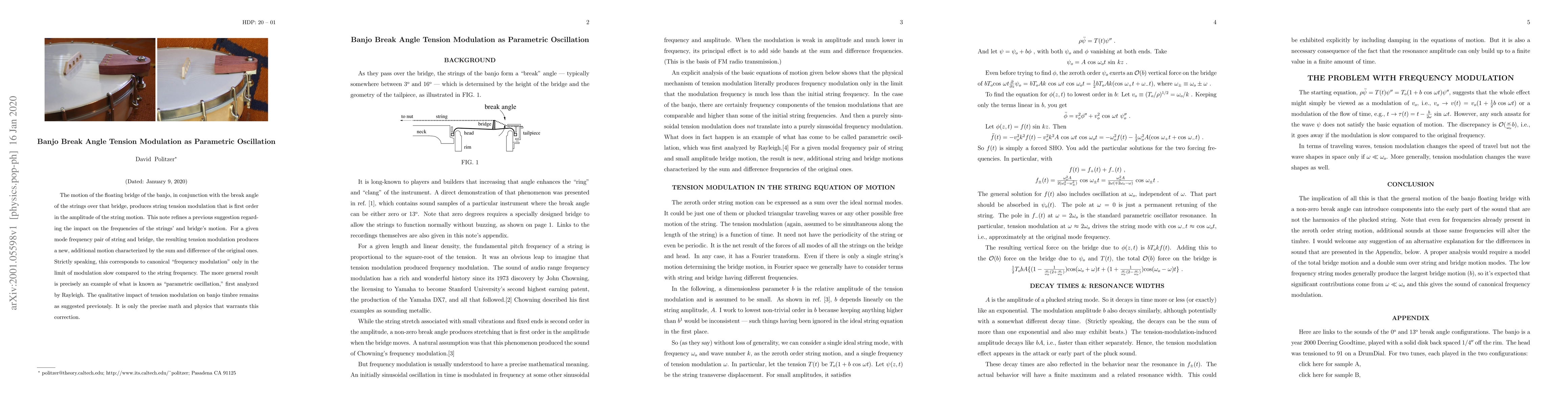 The motion of the floating bridge of the banjo, in conjunction with the break angle of the strings over that bridge, produces string tension modulation that is first order in the amplitude of the string motion. This note refines a previous suggestion regarding the impact on the frequencies of the strings' and bridge's motion. For a given mode frequency pair of string and bridge, the resulting tension modulation produces a new, additional motion characterized by the sum and difference of the original ones. Strictly speaking, this corresponds to canonical "frequency modulation" only in the limit of modulation slow compared to the string frequency. The more general result is precisely an example of what is known as "parametric oscillation," first analyzed by Rayleigh. The qualitative impact of tension modulation on banjo timbre remains as suggested previously. It is only the precise math and physics that warrants this correction.