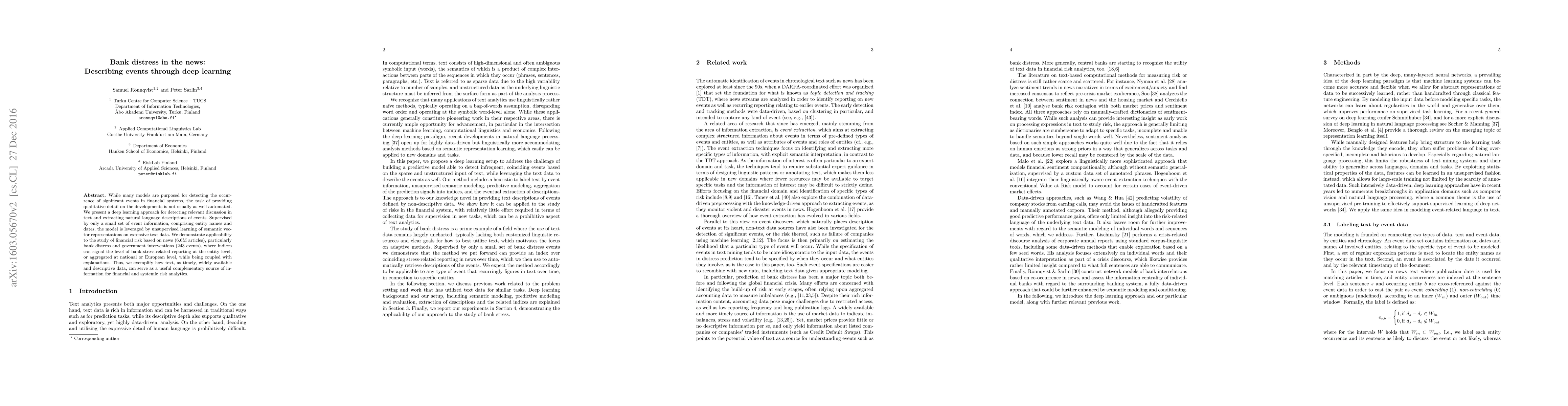 While many models are purposed for detecting the occurrence of significant events in financial systems, the task of providing qualitative detail on the developments is not usually as well automated. We present a deep learning approach for detecting relevant discussion in text and extracting natural language descriptions of events. Supervised by only a small set of event information, comprising entity names and dates, the model is leveraged by unsupervised learning of semantic vector representations on extensive text data. We demonstrate applicability to the study of financial risk based on news (6.6M articles), particularly bank distress and government interventions (243 events), where indices can signal the level of bank-stress-related reporting at the entity level, or aggregated at national or European level, while being coupled with explanations. Thus, we exemplify how text, as timely, widely available and descriptive data, can serve as a useful complementary source of information for financial and systemic risk analytics.